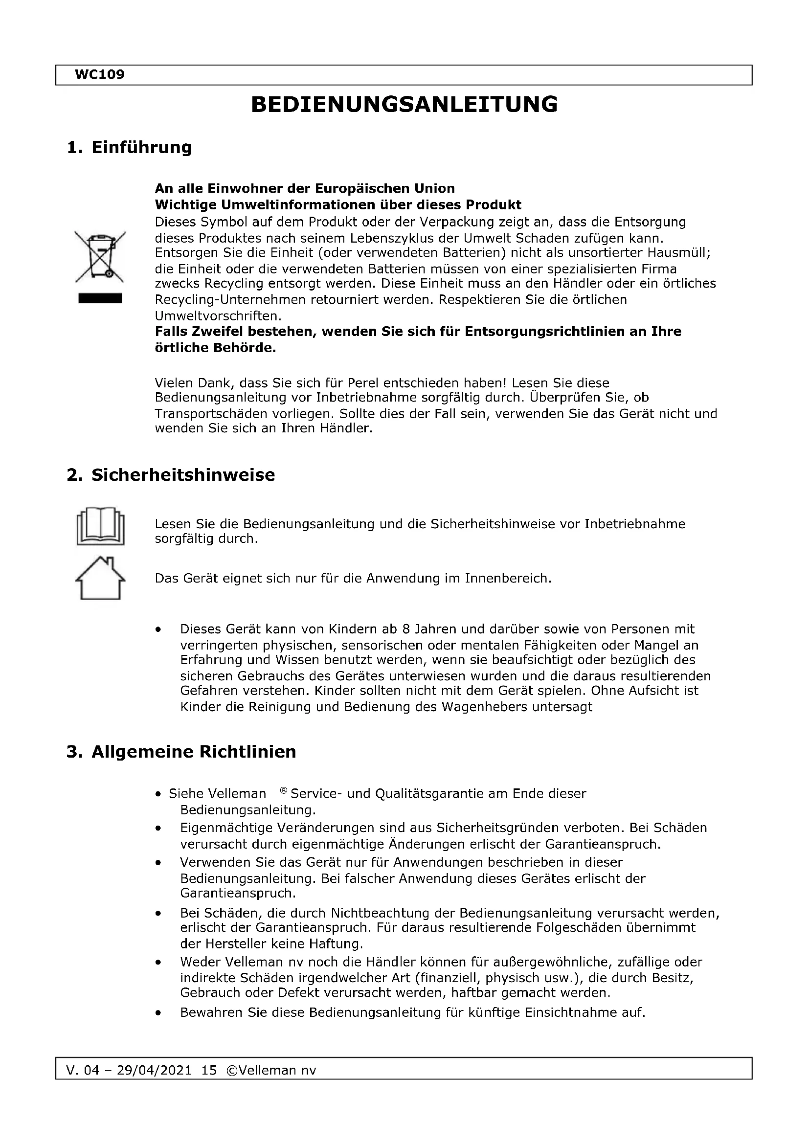 - Bewahren Sie diese Bedienungsanleitung für künftige Einsichtnahme auf.WC109