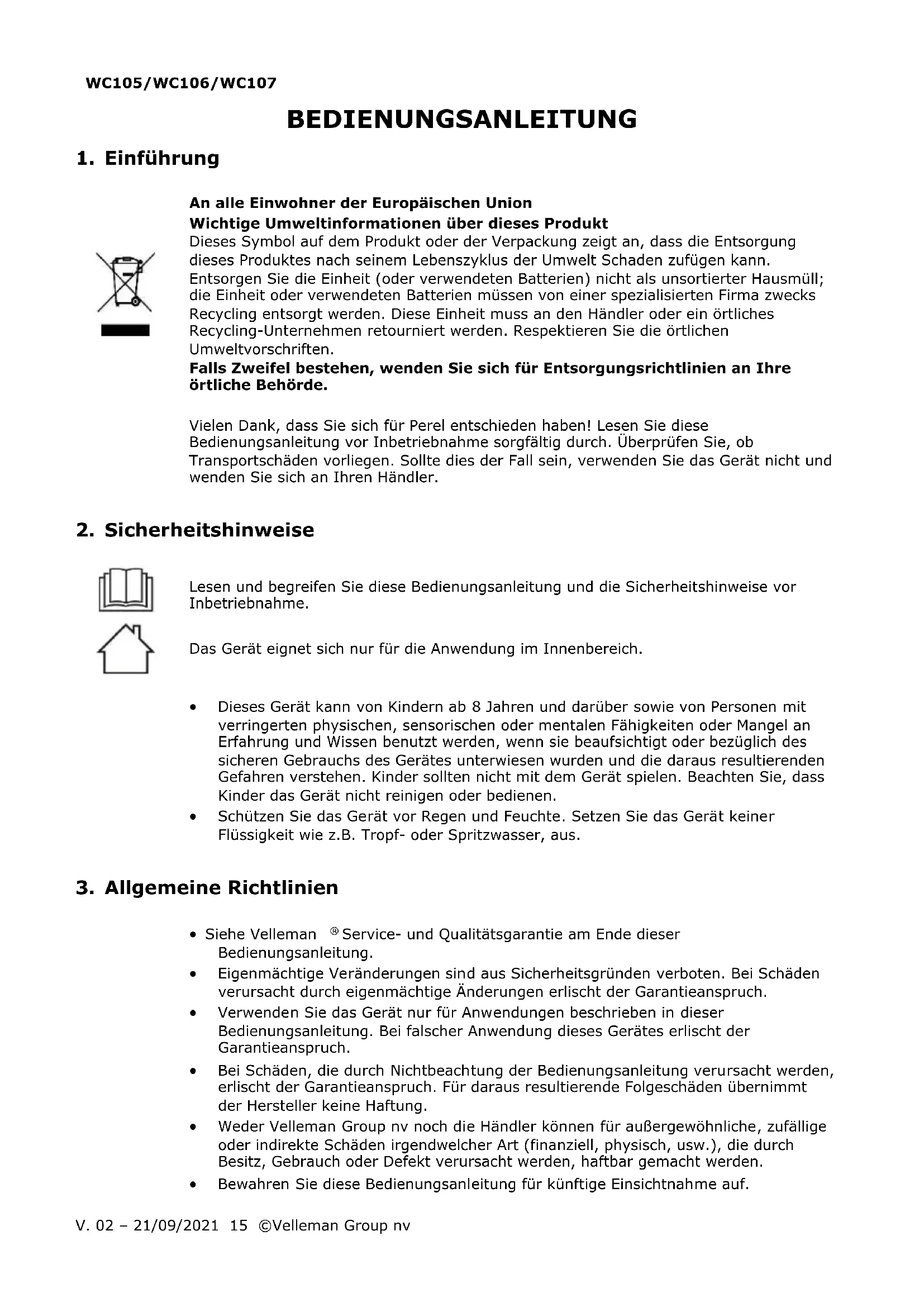 Velleman Group nv besitzt das Urheberrecht für diese Bedienungsanleitung. Alle weltweiten Rechte vorbehalten. Ohne vorherige schriftliche Genehmigung des Urhebers ist es nicht gestattet, diese Bedienungsanleitung ganz oder in Teilen zu reproduzieren, zu kopieren, zu übersetzen, zu bearbeiten oder zu speichern.WC105/WC106/WC107