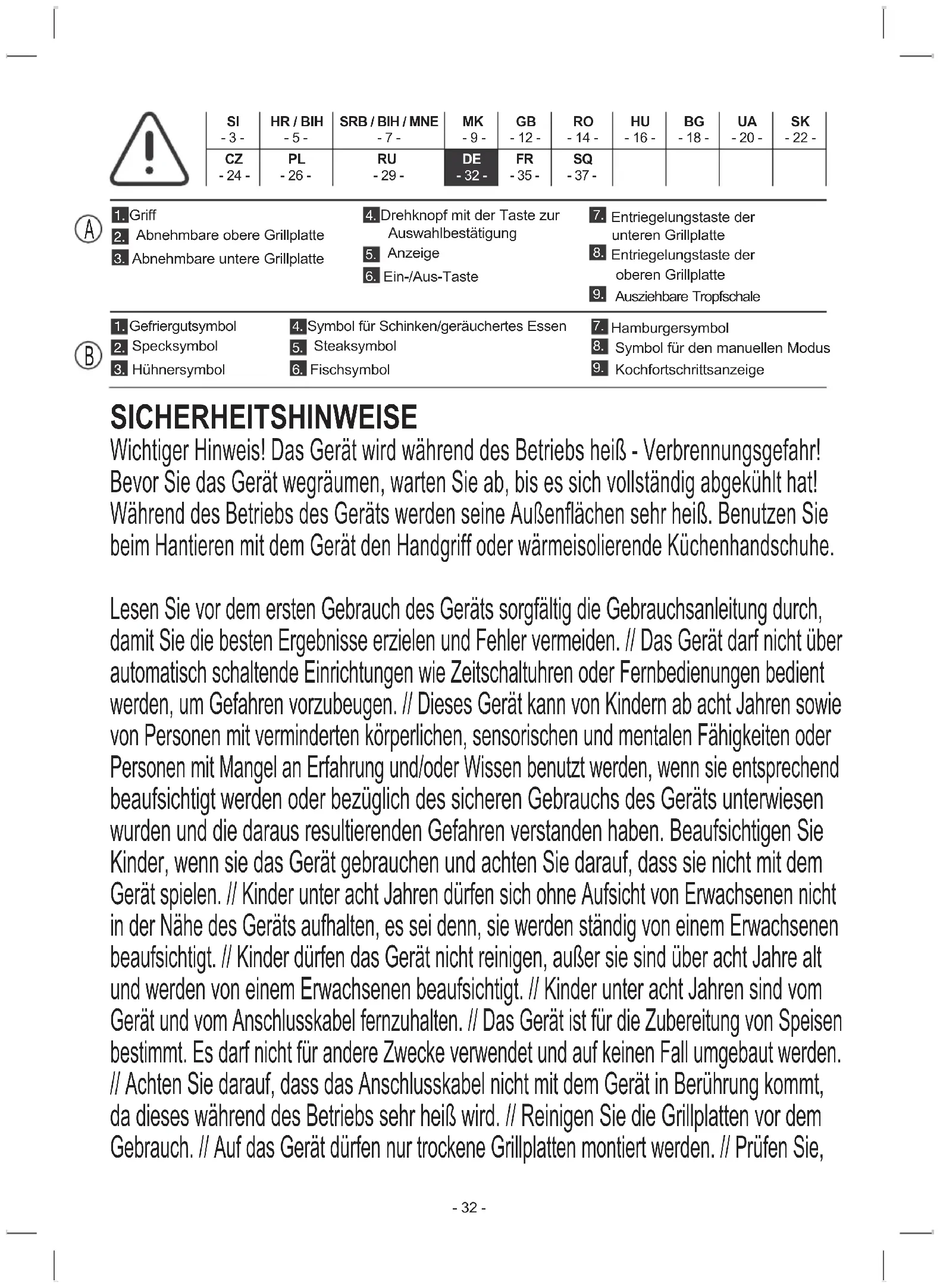 SICHERHEITSHINWEISE Wichtiger Hinweis! Das Gerät wird während des Betriebs heiß - Verbrennungsgefahr! Bevor Sie das Gerät wegräumen, warten Sie ab, bis es sich vollständig abgekühlt hat! Während des Betriebs des Geräts werden seine Außenächen sehr heiß. Benutzen Sie beim Hantieren mit dem Gerät den Handgriff oder wärmeisolierende Küchenhandschuhe. Lesen Sie vor dem ersten Gebrauch des Geräts sorgfältig die Gebrauchsanleitung durch, damit Sie die besten Ergebnisse erzielen und Fehler vermeiden. // Das Gerät darf nicht über automatisch schaltende Einrichtungen wie Zeitschaltuhren oder Fernbedienungen bedient werden, um Gefahren vorzubeugen. // Dieses Gerät kann von Kindern ab acht Jahren sowie von Personen mit verminderten körperlichen, sensorischen und mentalen Fähigkeiten oder Personen mit Mangel an Erfahrung und/oder Wissen benutzt werden, wenn sie entsprechend beaufsichtigt werden oder bezüglich des sicheren Gebrauchs des Geräts unterwiesen wurden und die daraus resultierenden Gefahren verstanden haben. Beaufsichtigen Sie Kinder, wenn sie das Gerät gebrauchen und achten Sie darauf, dass sie nicht mit dem Gerät spielen. // Kinder unter acht Jahren dürfen sich ohne Aufsicht von Erwachsenen nicht in der Nähe des Geräts aufhalten, es sei denn, sie werden ständig von einem Erwachsenen beaufsichtigt. // Kinder dürfen das Gerät nicht reinigen, außer sie sind über acht Jahre alt und werden von einem Erwachsenen beaufsichtigt. // Kinder unter acht Jahren sind vom Gerät und vom Anschlusskabel fernzuhalten. // Das Gerät ist für die Zubereitung von Speisen bestimmt. Es darf nicht für andere Zwecke verwendet und auf keinen Fall umgebaut werden. // Achten Sie darauf, dass das Anschlusskabel nicht mit dem Gerät in Berührung kommt, da dieses während des Betriebs sehr heiß wird. // Reinigen Sie die Grillplatten vor dem Gebrauch. // Auf das Gerät dürfen nur trockene Grillplatten montiert werden. // Prüfen Sie,