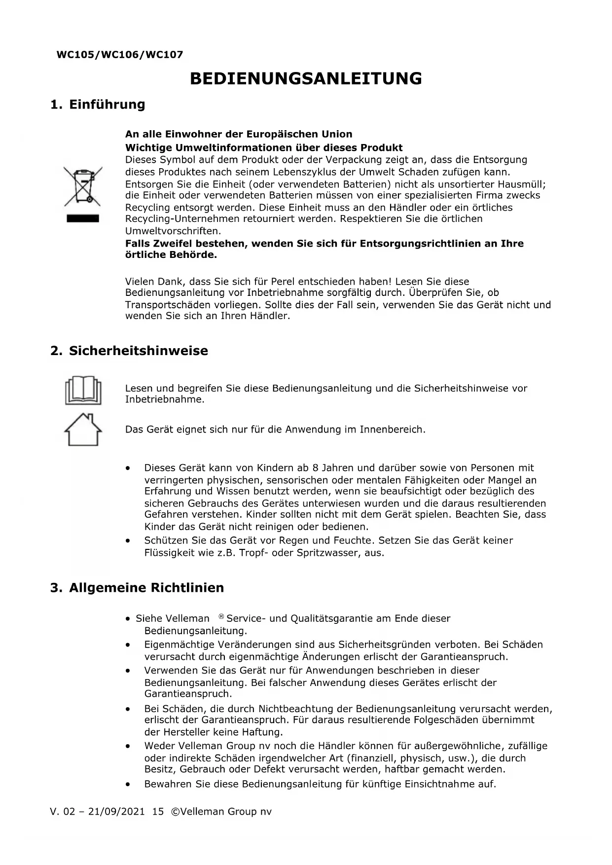 Velleman Group nv besitzt das Urheberrecht für diese Bedienungsanleitung. Alle weltweiten Rechte vorbehalten. Ohne vorherige schriftliche Genehmigung des Urhebers ist es nicht gestattet, diese Bedienungsanleitung ganz oder in Teilen zu reproduzieren, zu kopieren, zu übersetzen, zu bearbeiten oder zu speichern.WC105/WC106/WC107