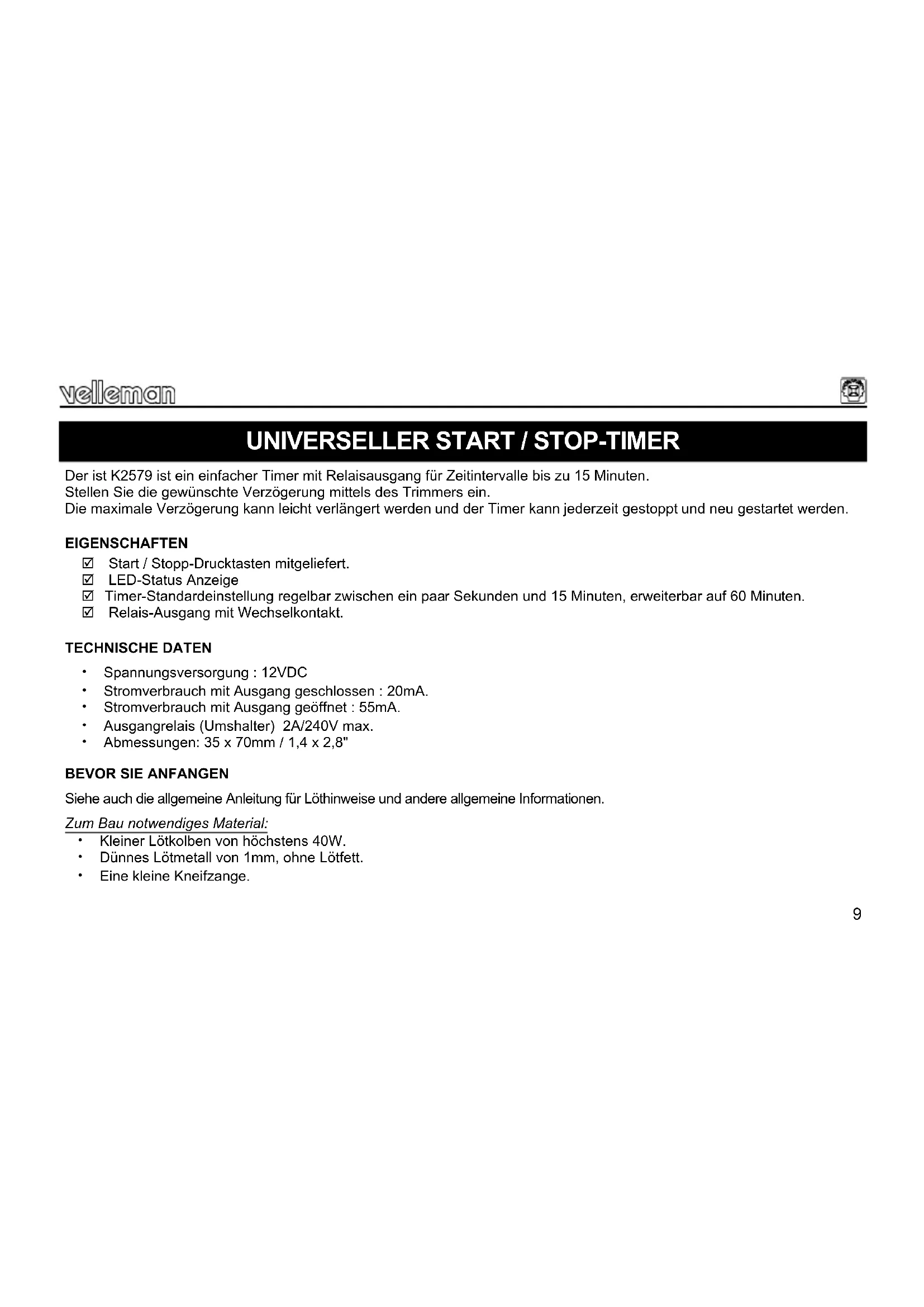 Verbinden Sie die Einheit mit einer 12VDC stabilisierten-Spannungsversorgung wie in der Abbildung gezeigt wird. Drehen Sie den Trimmer völlig gegen den Uhrzeigersinn. Drücken Sie auf die START-Taste. Das Relais wird vorübergehend aktiviert. Die Position des Trimmers bestimmt die ON-Zeit. Drehen Sie ihn im Uhrzeigersinn um die ON-zeit zu verlängern. Vergrößern Sie den C2-Wert für eine sogar längere Aktivierungsdauer. Die Einheit kann jederzeit mit der STOP-Taste gestoppt werden. Die START- und STOP-Tasten können entfernt montiert werden. Achten Sie darauf, dass Sie ein abgeschirmtes Kabel verwenden, vermeiden Sie Störung von außen und versuchen Sie, die Entfernung zwischen den Schaltern und der Platine möglichst kurz zu halten Der Timer ist mit einem Relaisausgang, der für zusätzliche Sicherheit vom Rest der Schaltung galvanisch getrennt ist, ausgestattet. Das Anschlussbeispiel zeigt de Funktionen der Pins der Relaiskontakte. Wenn das Relais verwendet wird um wichtige induktive Lasten, wie elektrische Motoren oder Transformatoren, zu schalten, könnte es nötig sein, ein Entlastungsnetzwerk über die Relaiskontakte anzubringen um übermäßigen Kontaktverschleiß zu vermeiden Eine gute HF-Entkoppelung des Netzteils ist wichtig. Über das Netzteil eintretende Impulse könnten den Stromkreis starten oder stoppen, ohne dass es gewünscht wird.12 El K2579 es un temporizador simple con una salida relé para un intervalo hasta 15 minutos. Introduzca la temporización deseada con el condensador ajustable. Es fácil prolongar el intervalo máximo y es posible activar o desactivar el temporizador en cualquier momento. Características: Con pulsadores START/STOP Indicación del estado por LEDs Temporizador ajustable de algunos segundos a 15 minutos. Es posible prolongarlo hasta 60 minutos. Salida de relé con contacto de conmutación Especificaciones: Alimentación : 12VDC Consumo Salida cerada : 20mA Consumo Salida abierta : 55mA Relé de salida (inversor) : 2A/240V max. Dimensiones : 35 x 70mm / 1,4 x 2,8"