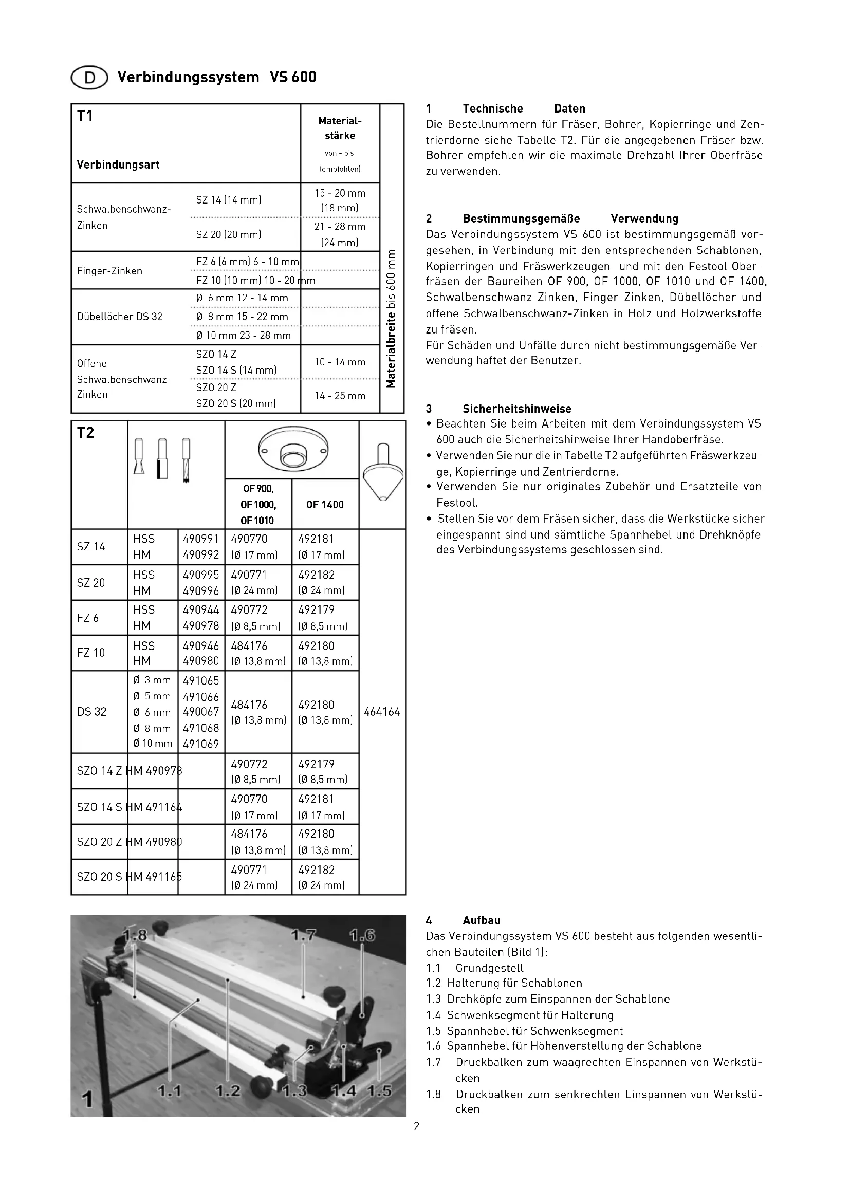 - Wiederholen Sie diesen Vorgang bis die Verbindung exakt stimmt. Fräsen der Zinken Fräsen Sie analog zur Probefräsung alle Zinken. 7 Anwendungsdatenbank Eine detaillierte Beschreibung der Einsatzmöglichkeiten des Verbindungssystems fi nden Sie auch in unserer Anwendungsda- tenbank im Internet unter “www.festool.com”. Weitere interessante Informationen zum Arbeiten mit Ihrem Festool Werkzeug fi nden Sie auf der Internetseite www.festool. de/fuer-zu-hause, z. B.: Anwendungsbeispiele • Tipps und Tricks,• Maschinenkunde,• Kostenlose Baupläne zum Download, • Wissenswertes rund ums Holz - Holzlexikon• 8 Zubehör Verwenden Sie nur das für diese Maschine vorgesehene origi- nale Festool-Zubehör und Festool-Verbrauchsmaterial, da diese System-Komponenten optimal aufeinander abgestimmt sind. Bei der Verwendung von Zubehör und Verbrauchsmaterial anderer Anbieter ist eine qualitative Beeinträchtigung der Arbeitsergeb- nisse und Einschränkung der Garantieansprüche wahrscheinlich. Je nach Anwendung kann sich der Verschleiß der Maschine oder Ihre persönliche Belastung erhöhen. Schützen Sie daher sich selbst, Ihre Maschine und Ihre Garantieansprüche durch die ausschließliche Nutzung von original Festool-Zubehör und Festool-Verbrauchsmaterial! Die Bestellnummern für Fräswerkzeuge, Schablonen und sonsti- ges Zubehör entnehmen Sie bitte der Tabelle T1, Ihrem Festool- Katalog oder unserer Internet Homepage “www.festool.com”. 9 Gewährleistung Für unsere Geräte leisten wir auf Material- oder Fertigungs-fehler Gewährleistung gemäß den länderspezifi schen gesetzlichen Be- stimmungen, mindestens jedoch 12 Monate. Innerhalb der Staaten der EU beträgt die Gewährleistungszeit 24 Monate (Nachweis durch Rechnung oder Lieferschein). Schäden, die insbesondere auf natürliche Abnützung/Verschleiß, Überlastung, unsachgemäße Behandlung bzw. durch den Verwender verschuldete Schäden oder sonstige Verwendung entgegen der Bedienungsanleitung zurückzuführen sind oder beim Kauf bekannt waren, bleiben von der Gewährleistung ausgeschlossen. Ebenso ausgeschlossen bleiben Schäden, die auf die Verwendung von nicht-originalem Festool Zubehör und Verbrauchmaterial (z. B. Schleifteller) zurückzuführen sind. Beanstandungen können nur anerkannt werden, wenn das Gerät unzerlegt an den Lieferanten oder an eine autorisierte Festool- Kundendienstwerkstätte zurückgesendet wird. Bewahren Sie Bedienungsanleitung, Sicherheitshinweise, Ersatzteilliste und Kaufbeleg gut auf. Im Übrigen gelten die jeweils aktuellen Ge- währleistungsbedingungen des Herstellers. Anmerkung Aufgrund der ständigen Forschungs- und Entwicklungsarbeiten sind Änderungen der hierin gemachten technischen Angaben vorbehalten. REACh für Festool Produkte, deren Zubehör und Verbrauchs- material: REACh ist die seit 2007 in ganz Europa gültige Chemi- kalienverordnung. Wir als „nachgeschalteter Anwender“, also als Hersteller von Erzeugnissen sind uns unserer Informationspfl icht unseren Kunden gegenüber bewusst. Um Sie immer auf den neu- esten Stand halten zu können und über mögliche Stoffe der Kan- didatenliste in unseren Erzeugnissen zu informieren, haben wir folgende Website für Sie eingerichtet: www.festool.com/reach14 1 Technical data The order numbers for cutters, drill bits, copying rings and centring mandrels can be found in Table T2. We recommend that you use the maximum speed of your router for the specifi ed cutters and drill bits. 2 Correct use The jointing system VS 600 has been designed to rout dovetail joints, slotted box joints, dowel holes and open dovetail tenons in wood and wooden materials in combination with the correspond- ing templates, copying rings and cutters with Festool routers from series OF 900, OF 1000, OF 1010 and OF 1400. The user will be liable for damages and accidents due to incor- rect use. 3 Safety instructions