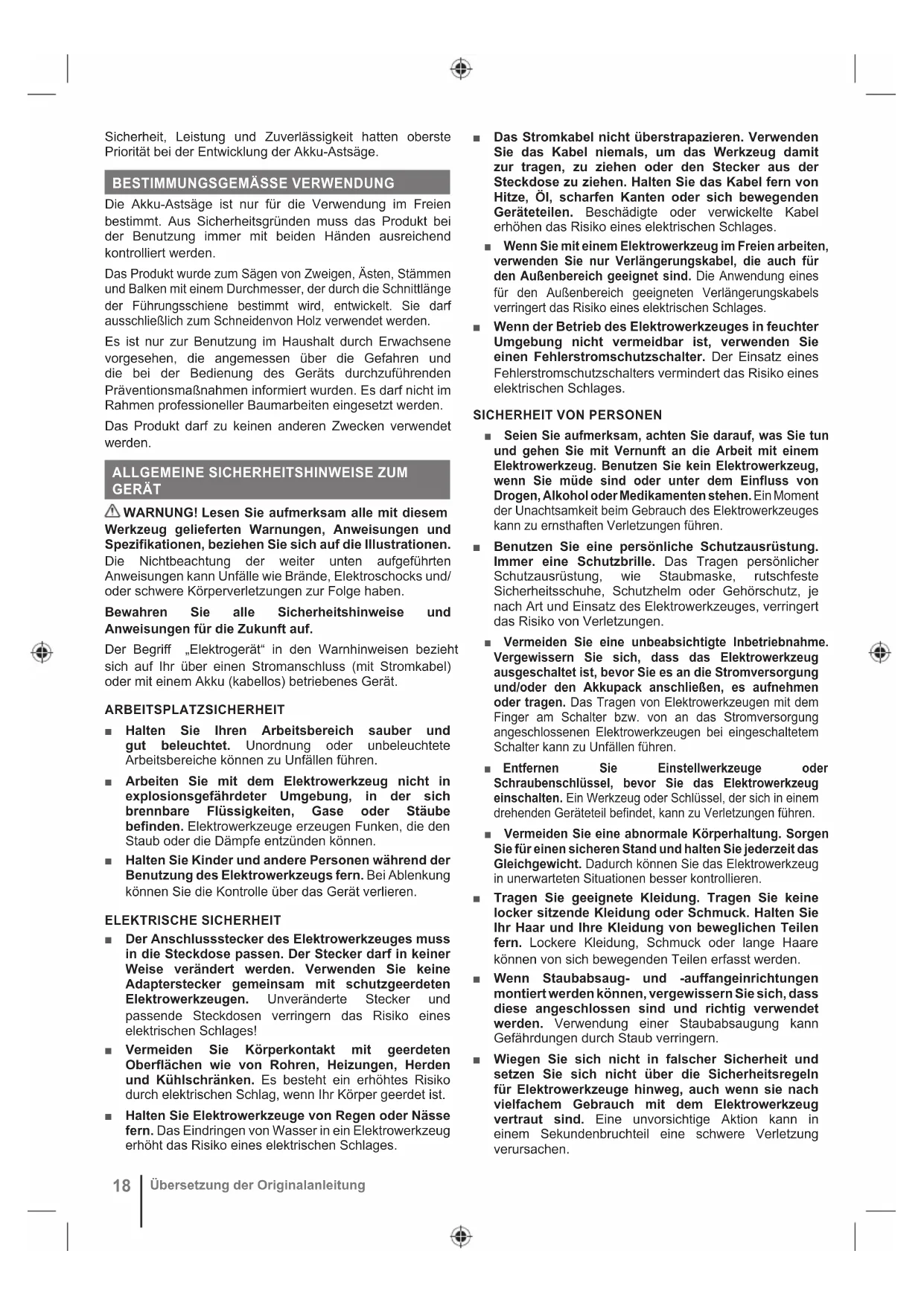 ASTSÄGE ■ Halten Sie alle Körperteile von der Sägekette fern, wenn die Astsäge in Betrieb ist. Vergewissern Sie sich vor dem Start der Astsäge, dass die Sägekette nichts berührt. Ein Moment der Unachtsamkeit beim Arbeiten mit der Astsäge kann dazu führen, dass sich Ihre Kleidung oder Ihr Körper in der Sägekette verfangen. ■ Halten Sie die Astsäge immer mit einer Hand am hinteren Haltegriff und mit der anderen Hand am vorderen Haltegriff. ■ Halten Sie die Astsäge nur an den isolierten Greifflächen, da die Sägekette in Kontakt mit verborgener Verkabelung kommen kann. Wenn die Sägeketten Kontakt zu einem stromführenden Draht hat, kann das dazu führen, dass offenliegende Metallteile der Astsäge ebenfalls Strom führen, und der Bediener könnte einen Stromschlag erleiden. ■ Tragen Sie einen Augenschutz Es wird empfohlen, weitere Schutzausrüstung für Gehör, Kopf, Hände, Beine und Füße zu tragen. Angemessene Schutzausrüstung verringert das persönliche Risiko durch umherfliegende Teile oder versehentliches Berühren der Kettensäge. ■ Bedienen Sie die Astsäge nicht auf Bäumen, auf Leitern, von einem Dach aus oder auf einer anderen Art von instabilem Untergrund. Das Bedienen einer Astsäge auf diese Art kann zu schwerwiegenden Verletzungen führen. ■ Achten Sie immer auf einen sicheren Stand und bedienen Sie die Astsäge nur, wenn Sie auf einer festen, sicheren und ebenen Fläche stehen.20 Übersetzung der Originalanleitung Rutschige oder instabile Böden können zu einem Verlust des Gleichgewichts oder der Kontrolle über die Astsäge führen. ■ Rechnen Sie beim Sägen eines Astes, der unter Spannung steht, dass er zurückschnellen kann. Wenn die Spannung der Holzfasern nachlässt, kann der federbelastete Ast den Bediener treffen und/oder die Astsäge außer Kontrolle geraten lassen. ■ Seien Sie besonders vorsichtig beim Schneiden von Unterholz und jungen Bäumen. Das dünne Material kann sich in der Sägekette verfangen und auf Sie schlagen oder Sie aus dem Gleichgewicht bringen. ■ Tragen Sie die Astsäge am hinteren Haltegriff, wobei die Säge ausgeschaltet und vom Körper entfernt sein muss. Bringen Sie beim Transport oder der Lagerung der Astsäge immer den Schwertschutz an. Die richtige Handhabung der Astsäge verringert die Wahrscheinlichkeit eines versehentlichen Kontakts mit der sich bewegenden Sägekette. ■ Befolgen Sie die Anweisungen zum Schmieren, zum Spannen der Kette und zum Wechseln von Leiste und Kette. Eine unsachgemäß gespannte oder geschmierte Kette kann entweder reißen oder das Rückschlagrisiko erhöhen. ■ Nur Holz sägen. Verwenden Sie die Astsäge nicht für andere Zwecke als vorgesehen. Beispielsweise: Nutzen Sie die Astsäge nicht zum Schneiden von Metall, Kunststoff, Gemäuer oder Baumaterial, das nicht aus Holz besteht. Die Verwendung der Astsäge für andere als die vorgesehenen Zwecke kann zu einer gefährlichen Situation führen. ■ Diese Astsäge ist nicht zum Fällen von Bäumen konzipiert. Die Nutzung der Astsäge für andere als die vorgesehenen Anwendungen kann zu schwerwiegenden Verletzungen des Bedieners und umstehender Personen führen. ■ Befolgen Sie beim Entfernen von eingeklemmtem Material, beim Aufbewahren und beim Warten der Astsäge alle Anweisungen. Vergewissern Sie sich, dass das Gerät ausgeschaltet ist und der Akkupack entfernt wurde. Unerwartetes Ingangsetzen der Astsäge bei der Wartung oder beim Entfernen von eingeklemmtem Material kann zu schwerwiegenden Personenschäden führen.