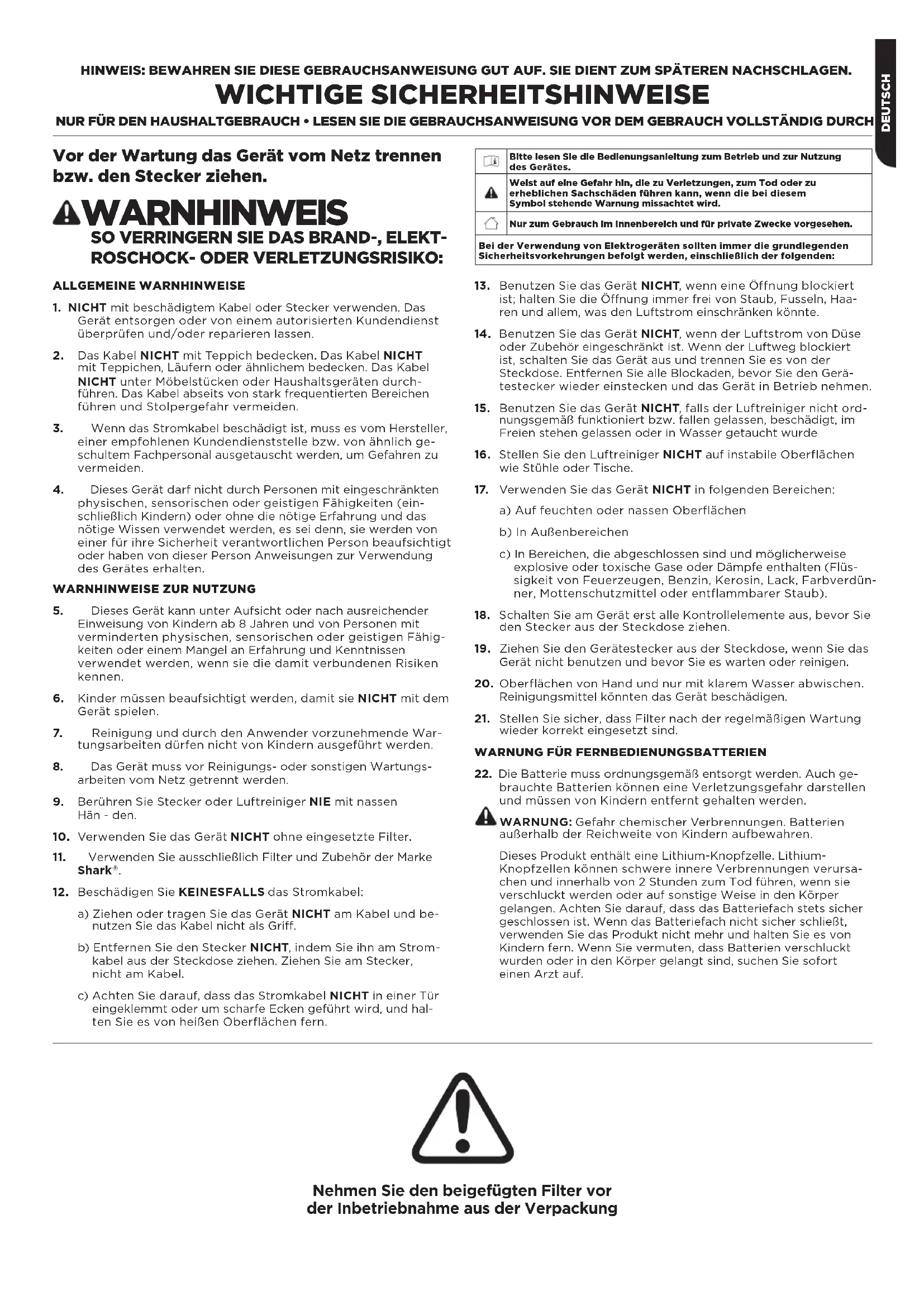 ROSCHOCK- ODER VERLETZUNGSRISIKO: Nehmen Sie den beigefügten Filter vor der Inbetriebnahme aus der Verpackung ALLGEMEINE WARNHINWEISE1. NICHT mit beschädigtem Kabel oder Stecker verwenden. Das Gerät entsorgen oder von einem autorisierten Kundendienst überprüfen und/oder reparieren lassen.