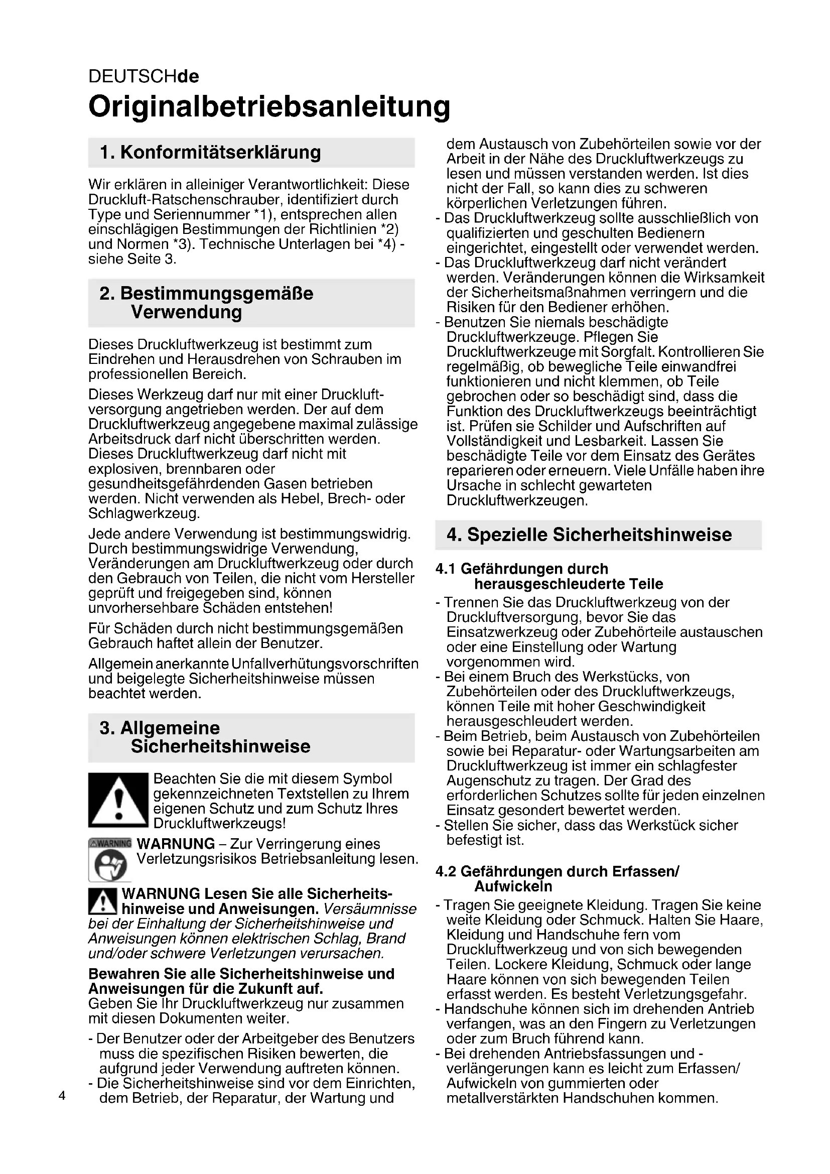 Originalbetriebsanleitung Wir erklären in alleiniger Verantwortlichkeit: Diese Druckluft-Ratschenschrauber, identifiziert durch Type und Seriennummer *1), entsprechen allen einschlägigen Bestimmungen der Richtlinien *2) und Normen *3). Technische Unterlagen bei *4) - siehe Seite 3. Dieses Druckluftwerkzeug ist bestimmt zum Eindrehen und Herausdrehen von Schrauben im professionellen Bereich. Dieses Werkzeug darf nur mit einer Druckluft- versorgung angetrieben werden. Der auf dem Druckluftwerkzeug angegebene maximal zulässige Arbeitsdruck darf nicht überschritten werden. Dieses Druckluftwerkzeug darf nicht mit explosiven, brennbaren oder gesundheitsgefährdenden Gasen betrieben werden. Nicht verwenden als Hebel, Brech- oder Schlagwerkzeug. Jede andere Verwendung ist bestimmungswidrig. Durch bestimmungswidrige Verwendung, Veränderungen am Druckluftwerkzeug oder durch den Gebrauch von Teilen, die nicht vom Hersteller geprüft und freigegeben sind, können unvorhersehbare Schäden entstehen! Für Schäden durch nicht bestimmungsgemäßen Gebrauch haftet allein der Benutzer. Allgemein anerkannte Unfallverhütungsvorschriften und beigelegte Sicherheitshinweise müssen beachtet werden. Beachten Sie die mit diesem Symbol gekennzeichneten Textstellen zu Ihrem eigenen Schutz und zum Schutz Ihres Druckluftwerkzeugs! WARNUNG – Zur Verringerung eines Verletzungsrisikos Betriebsanleitung lesen. WARNUNG Lesen Sie alle Sicherheits- hinweise und Anweisungen. Versäumnisse bei der Einhaltung der Sicherheitshinweise und Anweisungen können elektrischen Schlag, Brand und/oder schwere Verletzungen verursachen. Bewahren Sie alle Sicherheitshinweise und Anweisungen für die Zukunft auf. Geben Sie Ihr Druckluftwerkzeug nur zusammen mit diesen Dokumenten weiter. - Der Benutzer oder der Arbeitgeber des Benutzers muss die spezifischen Risiken bewerten, die aufgrund jeder Verwendung auftreten können. - Die Sicherheitshinweise sind vor dem Einrichten, dem Betrieb, der Reparatur, der Wartung und dem Austausch von Zubehörteilen sowie vor der Arbeit in der Nähe des Druckluftwerkzeugs zu lesen und müssen verstanden werden. Ist dies nicht der Fall, so kann dies zu schweren körperlichen Verletzungen führen. - Das Druckluftwerkzeug sollte ausschließlich von qualifizierten und geschulten Bedienern eingerichtet, eingestellt oder verwendet werden. - Das Druckluftwerkzeug darf nicht verändert werden. Veränderungen können die Wirksamkeit der Sicherheitsmaßnahmen verringern und die Risiken für den Bediener erhöhen. - Benutzen Sie niemals beschädigte Druckluftwerkzeuge. Pflegen Sie Druckluftwerkzeuge mit Sorgfalt. Kontrollieren Sie regelmäßig, ob bewegliche Teile einwandfrei funktionieren und nicht klemmen, ob Teile gebrochen oder so beschädigt sind, dass die Funktion des Druckluftwerkzeugs beeinträchtigt ist. Prüfen sie Schilder und Aufschriften auf Vollständigkeit und Lesbarkeit. Lassen Sie beschädigte Teile vor dem Einsatz des Gerätes reparieren oder erneuern. Viele Unfälle haben ihre Ursache in schlecht gewarteten Druckluftwerkzeugen.