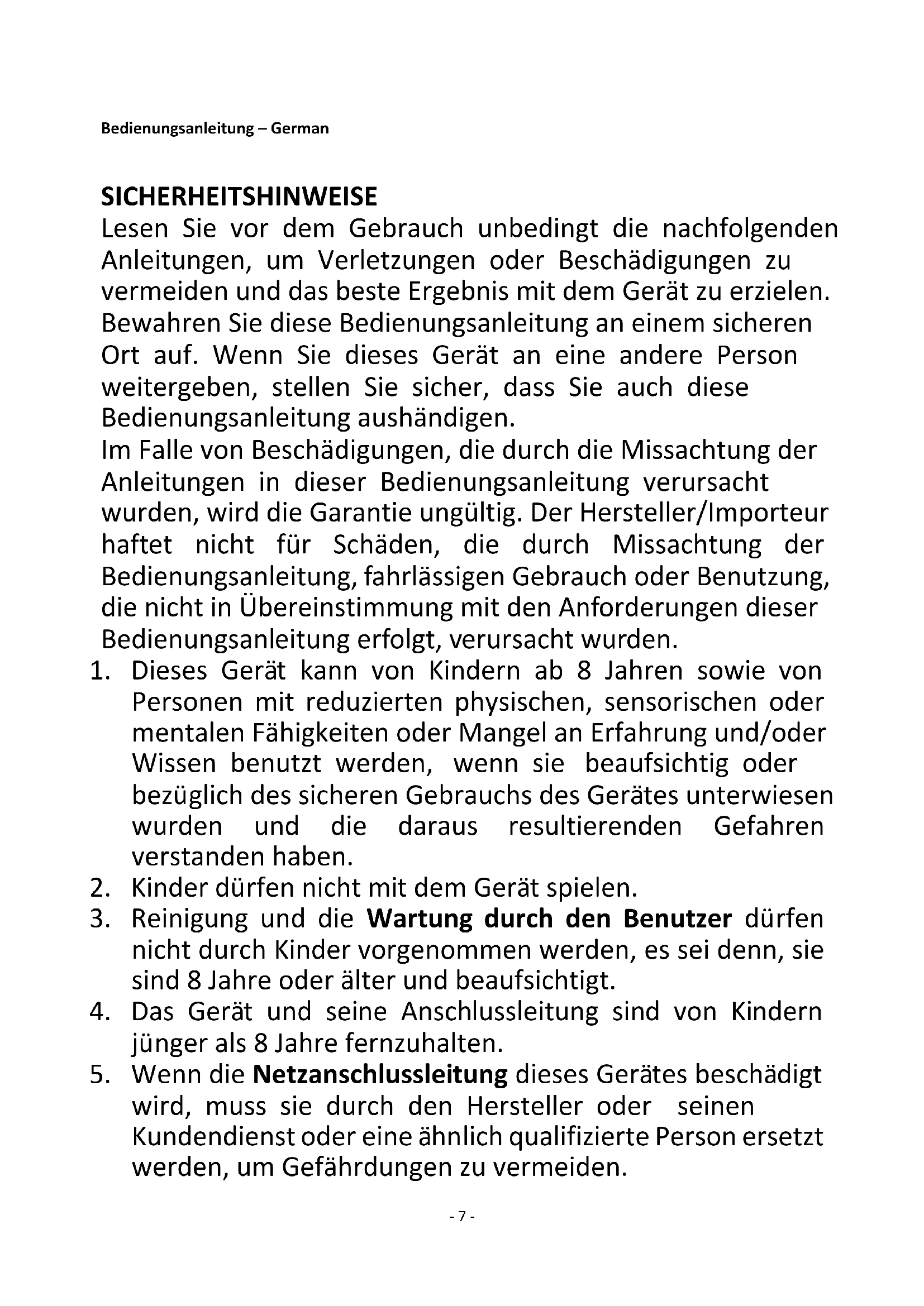 Recycling – European Directive 2012/19/EU This marking indicates that this product should not be disposed with other household wastes. To prevent possible harm to the environment or human health from uncontrolled waste disposal, recycle it responsibly to promote the sustainable reuse of material resources. To return your used device, please use the return and collection systems or contact the retailer where the product was purchased. They can take this product for environmental safe recycling. Emerio B.V. Customer service: Kundeninformation: Klantenservice: Oudeweg 115 T: +31 (0) 23 3034369 T: +49 (0) 3222 1097 600 T: +31 (0) 23 3034369 2031 CC Haarlem www.emerio.eu/service www.emerio.eu/service www.emerio.eu/service The Netherlands Looking for spare parts? Have a look at www.spareparts.emerio.eu Sie brauchen Ersatzteile? Besuchen Sie www.ersatzteile.emerio.eu Onderdelen nodig? Kijk op www.onderdelen.emerio.eu- 7 - Bedienungsanleitung – German SICHERHEITSHINWEISE Lesen Sie vor dem Gebrauch unbedingt die nachfolgenden Anleitungen, um Verletzungen oder Beschädigungen zu vermeiden und das beste Ergebnis mit dem Gerät zu erzielen. Bewahren Sie diese Bedienungsanleitung an einem sicheren Ort auf. Wenn Sie dieses Gerät an eine andere Person weitergeben, stellen Sie sicher, dass Sie auch diese Bedienungsanleitung aushändigen. Im Falle von Beschädigungen, die durch die Missachtung der Anleitungen in dieser Bedienungsanleitung verursacht wurden, wird die Garantie ungültig. Der Hersteller/Importeur haftet nicht für Schäden, die durch Missachtung der Bedienungsanleitung, fahrlässigen Gebrauch oder Benutzung, die nicht in Übereinstimmung mit den Anforderungen dieser Bedienungsanleitung erfolgt, verursacht wurden.