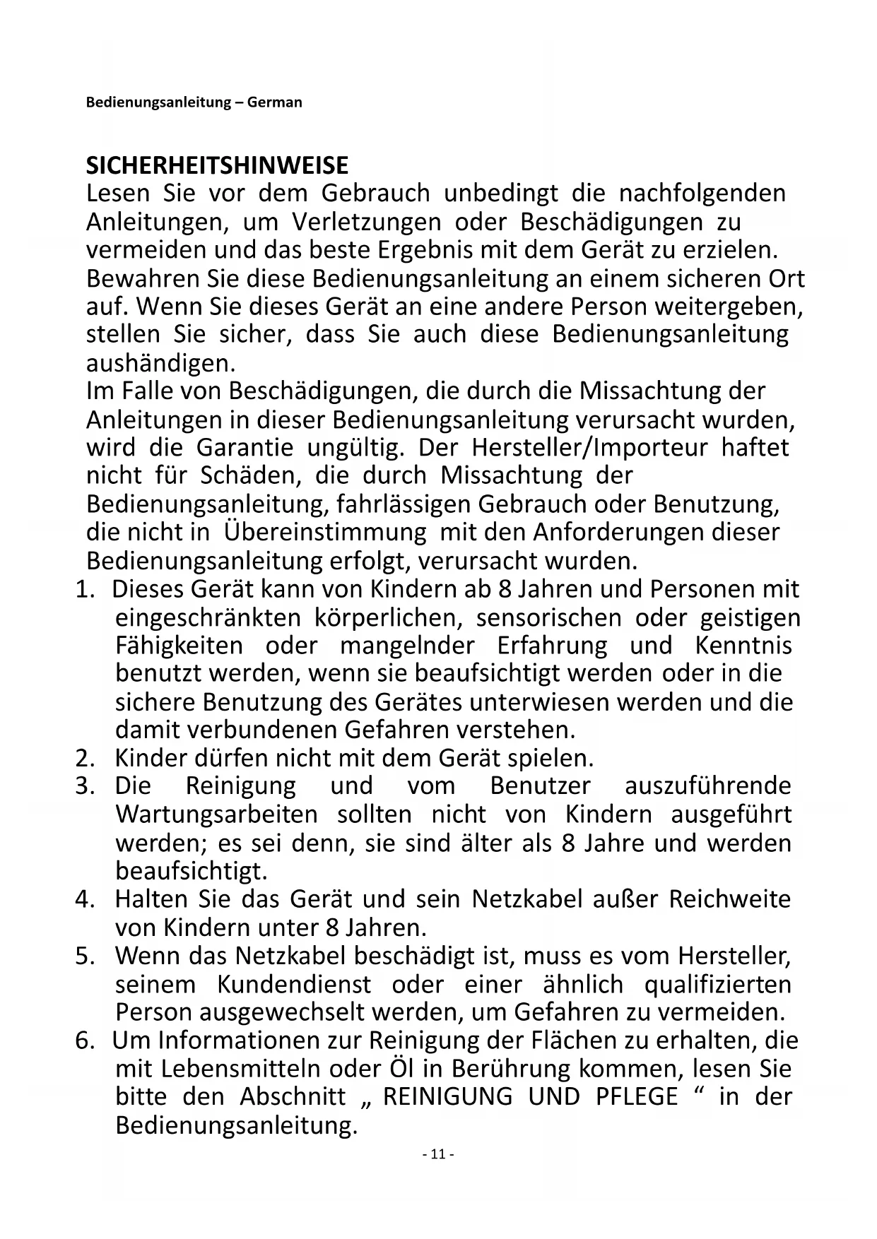 Recycling – European Directive 2012/19/EU This marking indicates that this product should not be disposed with other household wastes. To prevent possible harm to the environment or human health from uncontrolled waste disposal, recycle it responsibly to promote the sustainable reuse of material resources. To return your used device, please use the return and collection systems or contact the retailer where the product was purchased. They can take this product for environmental safe recycling. Emerio B.V. Customer service: Kundeninformation: Klantenservice: Oudeweg 115 T: +31 (0) 23 3034369 T: +49 (0) 3222 1097 600 T: +31 (0) 23 3034369 2031 CC Haarlem www.emerio.eu/service www.emerio.eu/service www.emerio.eu/service The Netherlands- 11 - Bedienungsanleitung – German SICHERHEITSHINWEISE Lesen Sie vor dem Gebrauch unbedingt die nachfolgenden Anleitungen, um Verletzungen oder Beschädigungen zu vermeiden und das beste Ergebnis mit dem Gerät zu erzielen. Bewahren Sie diese Bedienungsanleitung an einem sicheren Ort auf. Wenn Sie dieses Gerät an eine andere Person weitergeben, stellen Sie sicher, dass Sie auch diese Bedienungsanleitung aushändigen. Im Falle von Beschädigungen, die durch die Missachtung der Anleitungen in dieser Bedienungsanleitung verursacht wurden, wird die Garantie ungültig. Der Hersteller/Importeur haftet nicht für Schäden, die durch Missachtung der Bedienungsanleitung, fahrlässigen Gebrauch oder Benutzung, die nicht in Übereinstimmung mit den Anforderungen dieser Bedienungsanleitung erfolgt, verursacht wurden.