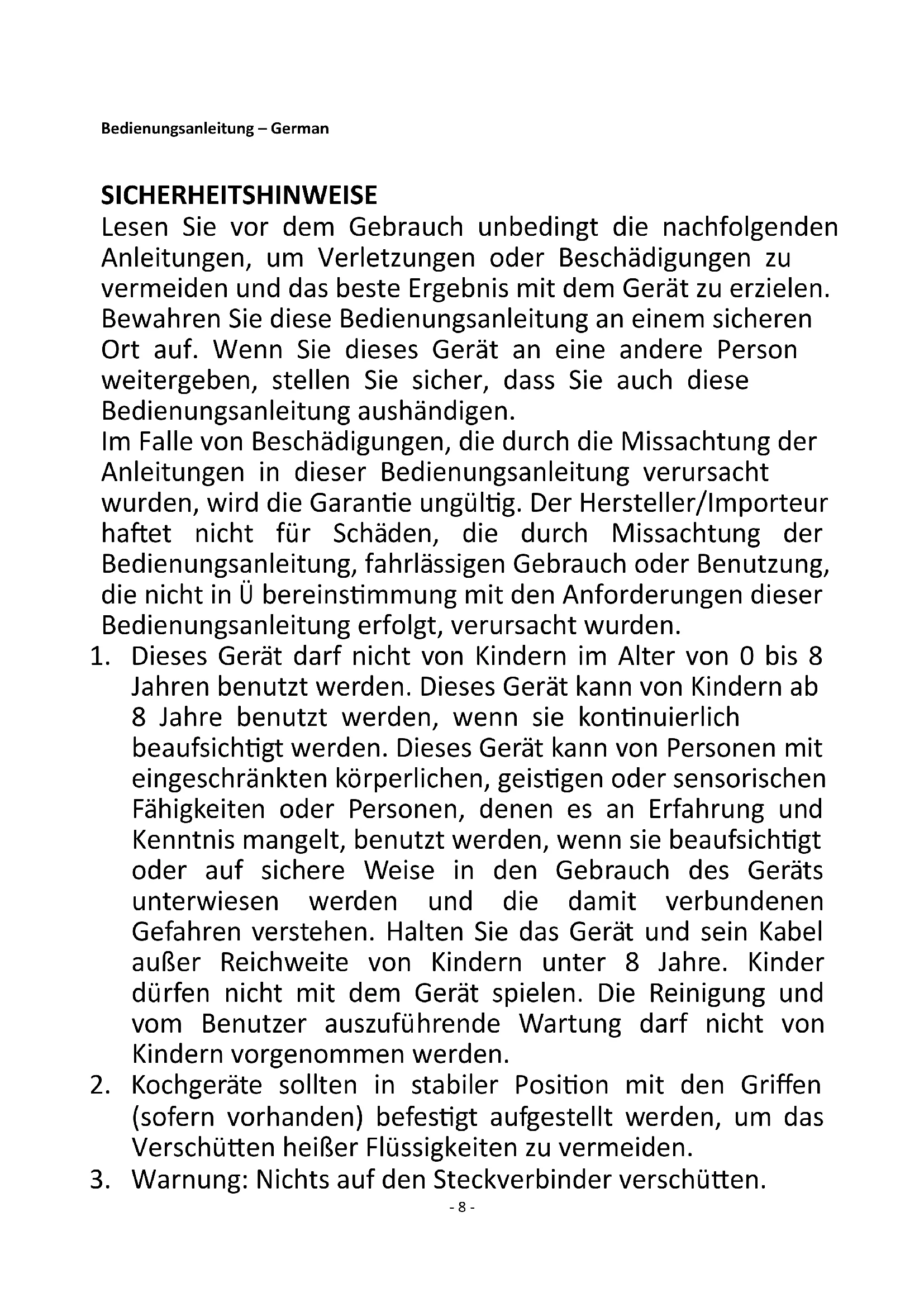 1. Dieses Gerät darf nicht von Kindern im Alter von 0 bis 8
