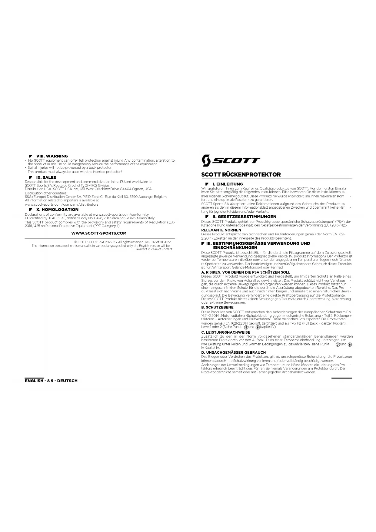 - VIII. WARNUNG - Kein SCOTT Produkt bietet vollkommenen Schutz gegen Abrieb. Jede Verschmutzung, Ände- rung am Produkt oder nicht bestimmungsgemäße Verwendung kann die Leistung des Produkts auf gefährliche Weise beeinträchtigen. - Keine Rückenschutz ist in der Lage, eine Verletzung der Wirbelsäule vollkommen ausschliessen. - Benutzen Sie das Produkt nur, wenn der Protektor an vorgesehener Stelle eingesetzt ist.