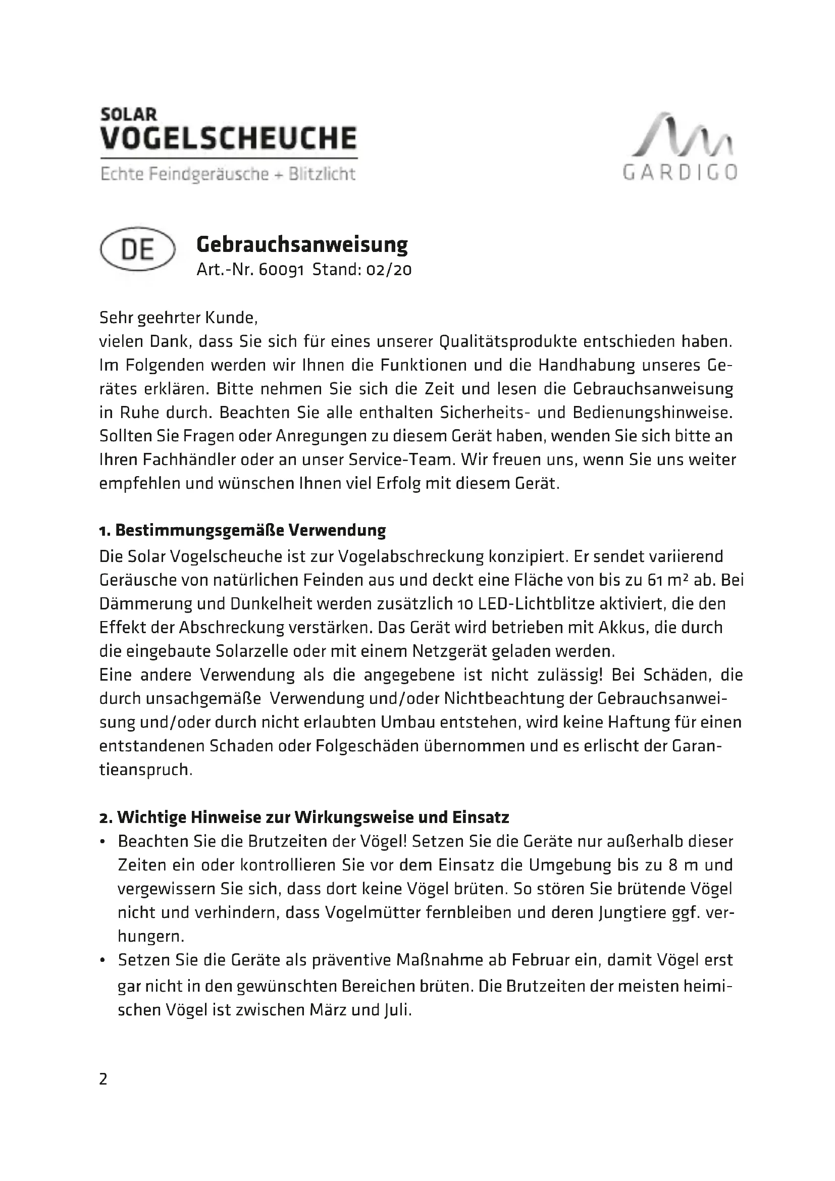 - Es ist zu beachten, dass Bedien- oder Anschlussfehler oder Schäden, die durch Nichtbeachtung der Bedienungsanleitung entstehen, außerhalb des Einflussbe- reichs der Gardigo liegen und für daraus resultierende Schäden keinerlei Haftung übernommen werden kann. Dies gilt auch dann, wenn Veränderungen oder Repa- raturversuche an dem Gerät vorgenommen wurden, Schaltungen abgeändert oder andere Bauteile verwendet wurden oder in anderer Weise Fehlbedienungen, fahr- lässige Behandlung oder Missbrauch zu Schäden geführt haben. In diesen Fällen erlischt auch die Garantie. Service-Hotline: Telefon (0 53 02) 9 34 87 88 Ihr Gardigo-Team8 SOLAR SCARECROW Instruction manual Art.-No. 60091 Status: 02/20 Dear customer, thank you for deciding on one of our quality products. In this manual we will explain the functions and the handling of our device. Please take your time to read through the manual and follow all safety and operational instructions in order to achieve best results. Keep this manual in a safe place and include it when passing the device on to another person. If you have suggestions or questions about this product please contact your dealer or our service team. We would be delighted if you would recommend us and wish you success with the use of this device.