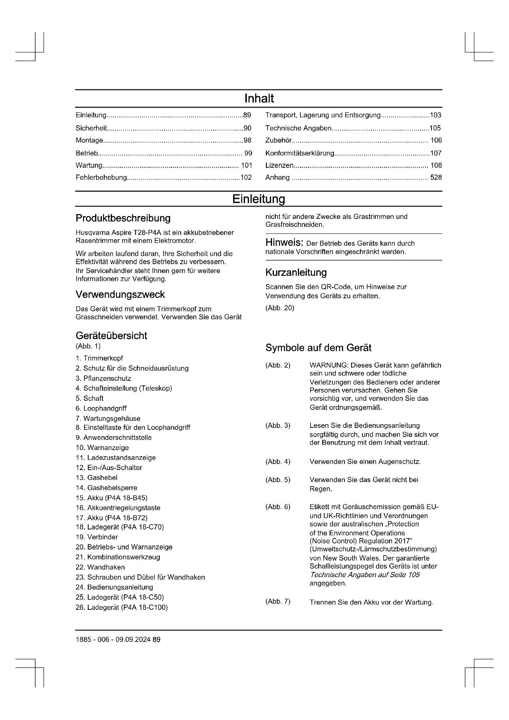 Ausgestattet mit Trimmerkopf (Original), vorne/hinten. 2,26/1,61 Akku P4A 18-B45 P4A 18-B72 Typ Lithium-Ionen Lithium-Ionen Akkukapazität, Ah Siehe Aufkleber zur Akkukapazität Siehe Aufkleber zur Akkukapazität Nennspannung, V 18 18 Gewicht, kg 0,4 0,7 Zugelassene Ladegeräte Ladegerät P4A 18-C50 P4A 18-C70 P4A 18-C100 Eingangsspannung, V Siehe Informationen zu Nenn- werten des Ladegeräts. Siehe Informationen zu Nennwerten des Ladege- räts. Siehe Informationen zu Nennwerten des Ladege- räts. Frequenz, Hz 50–60 50–60 50–60 Leistung, W 50 70 105 Ausgangsspannung, V DC/ Ampere, A 14,4-18/2 14,4-18/3 14,4-18/4,4 Zubehör Zugelassenes Zubehör Zugelassenes Zubehör Typ Schutz für die Schneidausrüstung, Teile-Nr. Trimmerkopf A15BM5 (Faden-Ø 1,6 mm) 536 47 32-01 106 1885 - 006 - 09.09.2024Konformitätserklärung EU-Konformitätserkärung Die Husqvarna AB, SE-561 82 Huskvarna, Schweden, Tel.: +46-36-146500, erklärt in alleiniger Verantwortung, dass das Gerät: Beschreibung Akku-Grastrimmer Marke Husqvarna Typ/Modell Aspire T28-P4A Identifizierung Seriennummern ab 2023 die folgenden EU-Richtlinien und -Verordnungen erfüllt: Richtlinie/Verord- nung Beschreibung 2006/42/EG „Maschinenrichtlinie“ 2014/30/EG „über elektromagnetische Verträglichkeit“ 2000/14/EG „über umweltbelastende Geräuschemissionen von zur Verwendung im Freien vorgesehenen Geräten und Maschinen“ 2011/65/EG „zur Beschränkung der Verwendung bestimmter gefährlicher Stoffe in Elektro- und Elektron- ikgeräten“ und dass die folgenden Normen und/oder technischen Daten angewendet werden: EN 60335-1:2012/ A15:2021, EN 50636-2-91:2014, EN IEC 63000:2018, EN IEC 55014-1:2021; EN IEC 55014-2:2021. Benannte Stelle: 0158 DEKRA Testing and Certification GmbH, Handwerkstraße 15, 70565 Stuttgart, Germany bestätigte die Konformität mit der Richtlinie 2000/14/EG, Konformitätsbewertungsverfahren nach: Anhang VI. Informationen zu Geräuschemission finden Sie unter Technische Angaben auf Seite 105