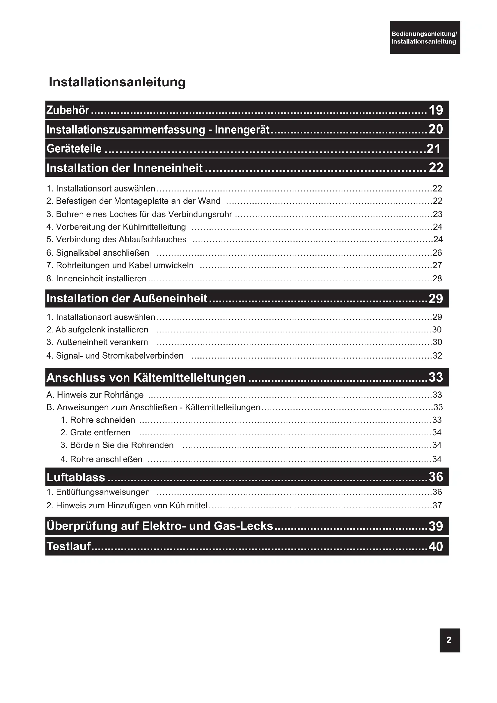der Inneneinheit“ und „Installation der Außeneinheit“.