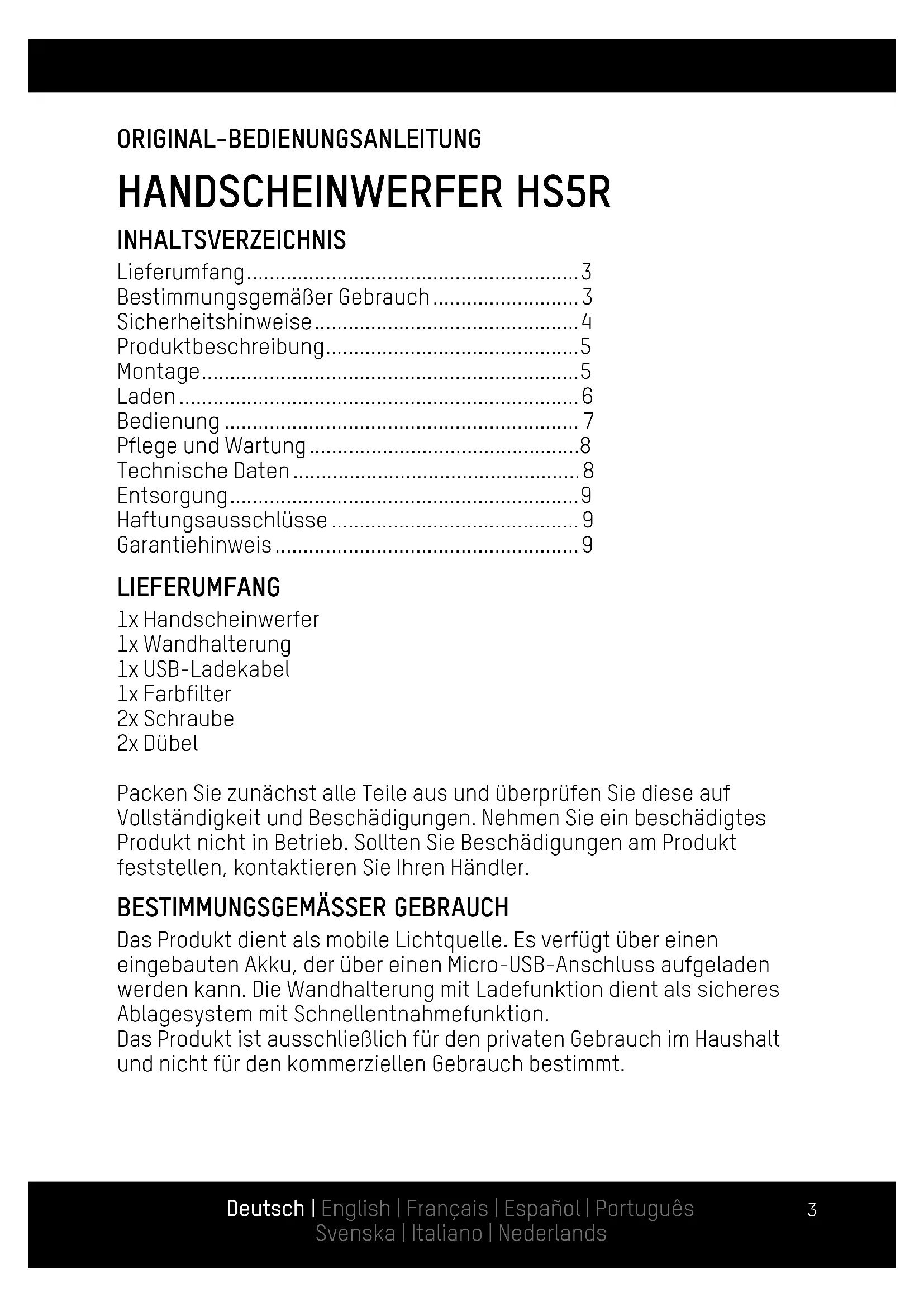 Das Produkt dient als mobile Lichtquelle. Es verfügt über einen eingebauten Akku, der über einen Micro-USB-Anschluss aufgeladen werden kann. Die Wandhalterung mit Ladefunktion dient als sicheres Ablagesystem mit Schnellentnahmefunktion. Das Produkt ist ausschließlich für den privaten Gebrauch im Haushalt und nicht für den kommerziellen Gebrauch bestimmt. Deutsch | English | Français | Español | Português Svenska | Italiano | Nederlands Deutsch | English | Français | Español | Português Svenska | Italiano | Nederlands4 SICHERHEITSHINWEISE Lesen Sie vor Inbetriebnahme des Produkts die komplette Bedienungsanleitung sorgfältig durch. Sie enthält wichtige Hinweise zum Umgang mit dem Produkt. Wenn Sie das Produkt an dritte Personen weiterreichen, händigen Sie diese Bedienungsanleitung mit aus.