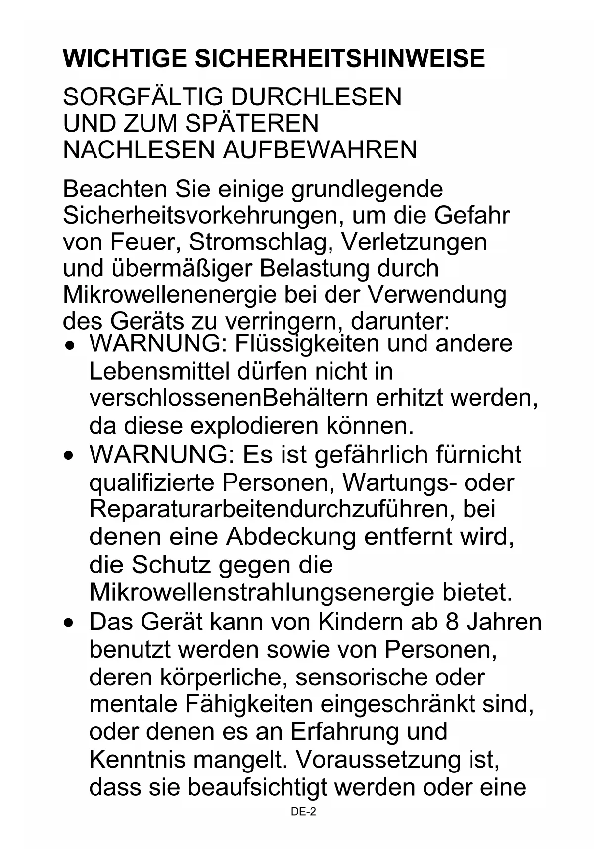 Der Mikrowellenofen dient zum Erhitzen von Speisen und Getränken. Das Trocknen von Lebensmitteln oder Kleidung sowie das Erhitzen von Wärmekissen, Hausschuhen, Schwämmen, feuchten Tüchern undDE-8 ähnlichem kann zu Verletzungen, Entzündungen oder Bränden führen.