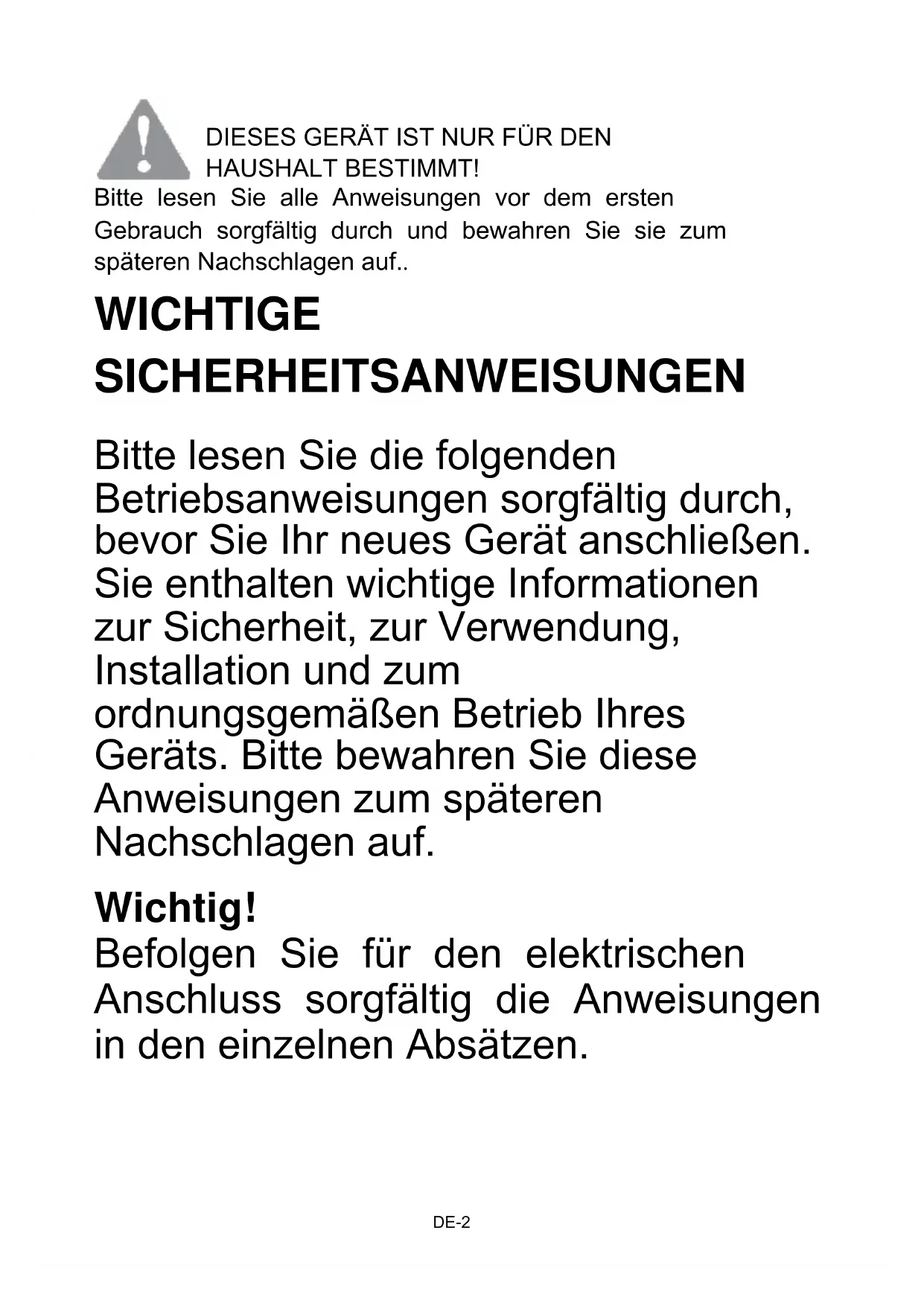 DIESES GERÄT IST NUR FÜR DEN HAUSHALT BESTIMMT! Bitte lesen Sie alle Anweisungen vor dem ersten Gebrauch sorgfältig durch und bewahren Sie sie zum späteren Nachschlagen auf.. WICHTIGE SICHERHEITSANWEISUNGEN Bitte lesen Sie die folgenden Betriebsanweisungen sorgfältig durch, bevor Sie Ihr neues Gerät anschließen. Sie enthalten wichtige Informationen zur Sicherheit, zur Verwendung, Installation und zum ordnungsgemäßen Betrieb Ihres Geräts. Bitte bewahren Sie diese Anweisungen zum späteren Nachschlagen auf. Wichtig! Befolgen Sie für den elektrischen Anschluss sorgfältig die Anweisungen in den einzelnen Absätzen.DE-3
