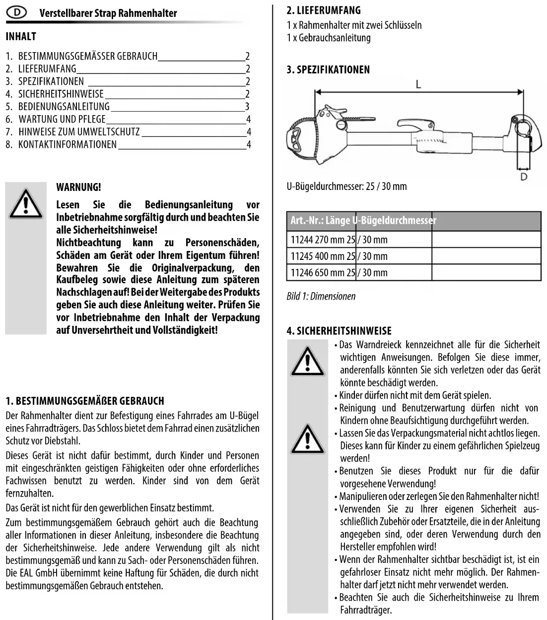 - Beachten Sie auch die Sicherheitshinweise zu Ihrem Fahrradträger. Verstellbarer Strap Rahmenhalter WARNUNG! Lesen Sie die Bedienungsanleitung vor Inbetriebnahme sorgfältig durch und beachten Sie alle Sicherheitshinweise! Nichtbeachtung kann zu Personenschäden, Schäden am Gerät oder Ihrem Eigentum führen! Bewahren Sie die Originalverpackung, den Kaufbeleg sowie diese Anleitung zum späteren Nachschlagen auf! Bei der Weitergabe des Produkts geben Sie auch diese Anleitung weiter. Prüfen Sie vor Inbetriebnahme den Inhalt der Verpackung auf Unversehrtheit und Vollständigkeit! Bild 1: Dimensionen Art.-Nr.: Länge U-Bügeldurchmesser 11244 270 mm 25 / 30 mm 11245 400 mm 25 / 30 mm 11246 650 mm 25 / 30 mm U-Bügeldurchmesser: 25 / 30 mm3 Wenn der Rahmenhalter auf 180 ° eingestellt wird, ist die Sicherheitsfunktion des Schlosses nicht mehr gegeben. Verwenden Sie den Rahmenhalter deshalb nur mit einem „leichten Knick“.