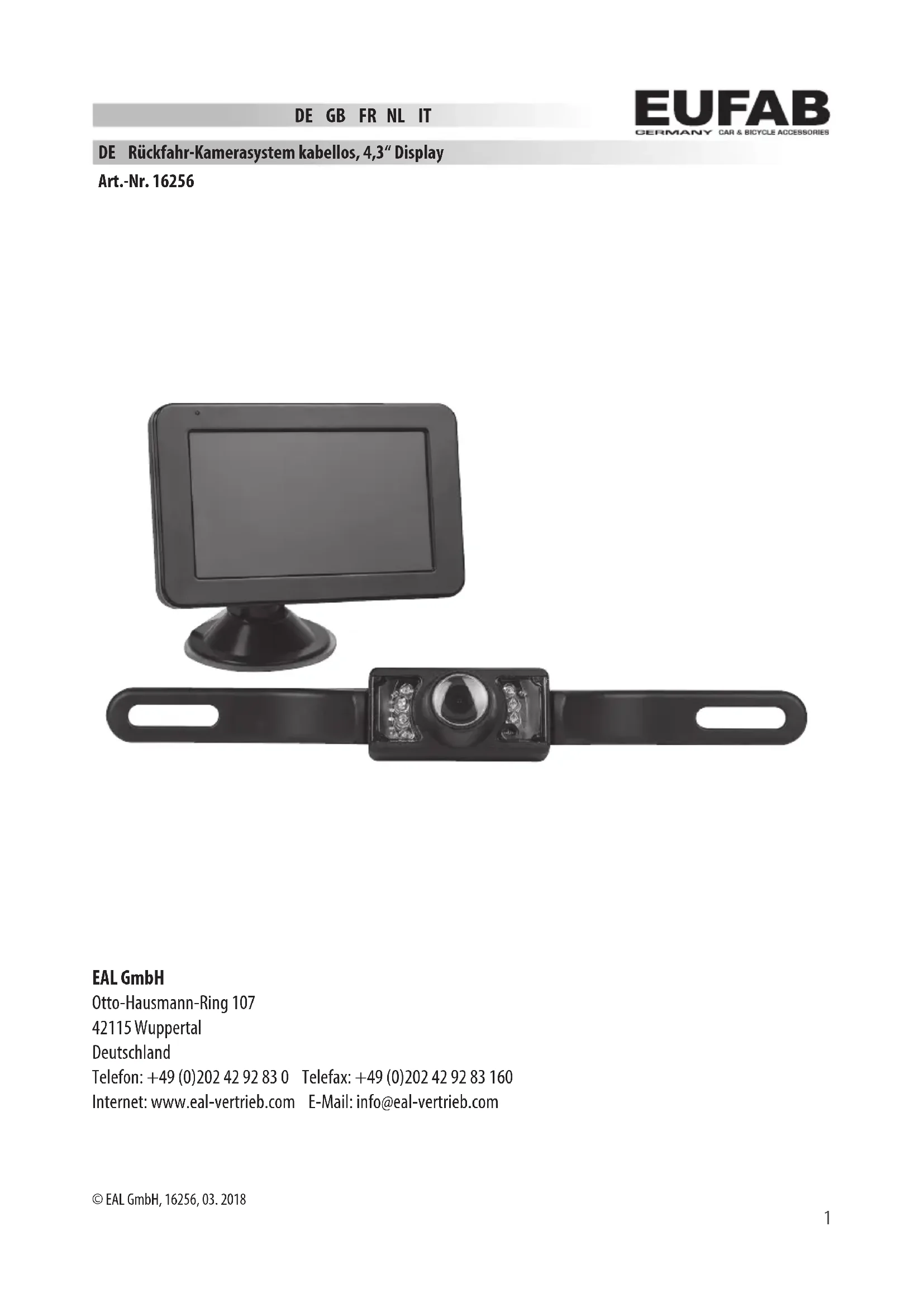 DE GB FR NL IT DE Rückfahr-Kamerasystem kabellos, 4,3“ Display Art.-Nr. 16256 EAL GmbH Otto-Hausmann-Ring 107 42115 Wuppertal Deutschland Telefon: +49 (0)202 42 92 83 0 Telefax: +49 (0)202 42 92 83 160 Internet: www.eal-vertrieb.com E-Mail: info@eal-vertrieb.com © EAL GmbH, 16256, 03. 20182 WARNUNG Lesen Sie die Bedienungsanleitung vor Inbetriebnahme sorgfältig durch und beachten Sie alle Sicherheitshinweise! Nichtbeachtung kann zu Personenschäden, Schäden am Gerät oder Ihrem Eigentum führen! Bewahren Sie die Originalverpackung, den Kaufbeleg sowie diese Anleitung zum späteren Nachschlagen auf! Bei der Weitergabe des Produkts geben Sie auch diese Anleitung weiter. Prüfen Sie vor Inbetriebnahme den Inhalt der Verpackung auf Unversehrtheit und Vollständigkeit! 1.Bestimmungsgemäßer Gebrauch