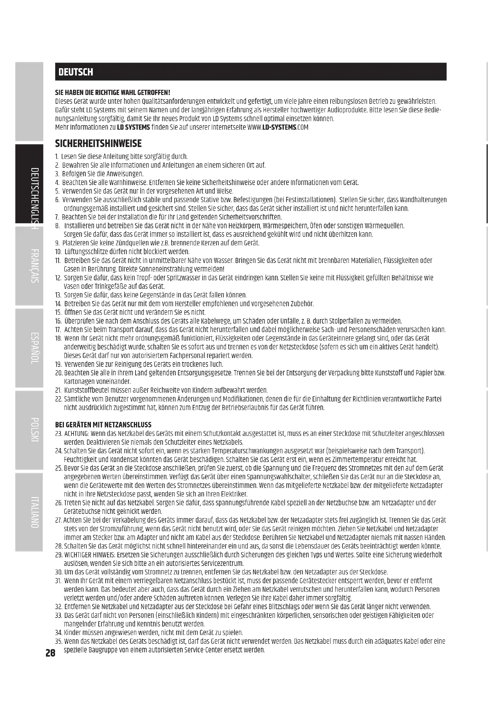 DEUTSCH SIE HABEN DIE RICHTIGE WAHL GETROFFEN! Dieses Gerät wurde unter hohen Qualitätsanforderungen entwickelt und gefertigt, um viele Jahre einen reibungslosen Betrieb zu gewährleisten. Dafür steht LD Systems mit seinem Namen und der langjährigen Erfahrung als Hersteller hochwertiger Audioprodukte. Bitte lesen Sie diese Bedie- nungsanleitung sorgfältig, damit Sie Ihr neues Produkt von LD Systems schnell optimal einsetzen können. Mehr Informationen zu LD SYSTEMS finden Sie auf unserer Internetseite WWW.LD-SYSTEMS.COM SICHERHEITSHINWEISE