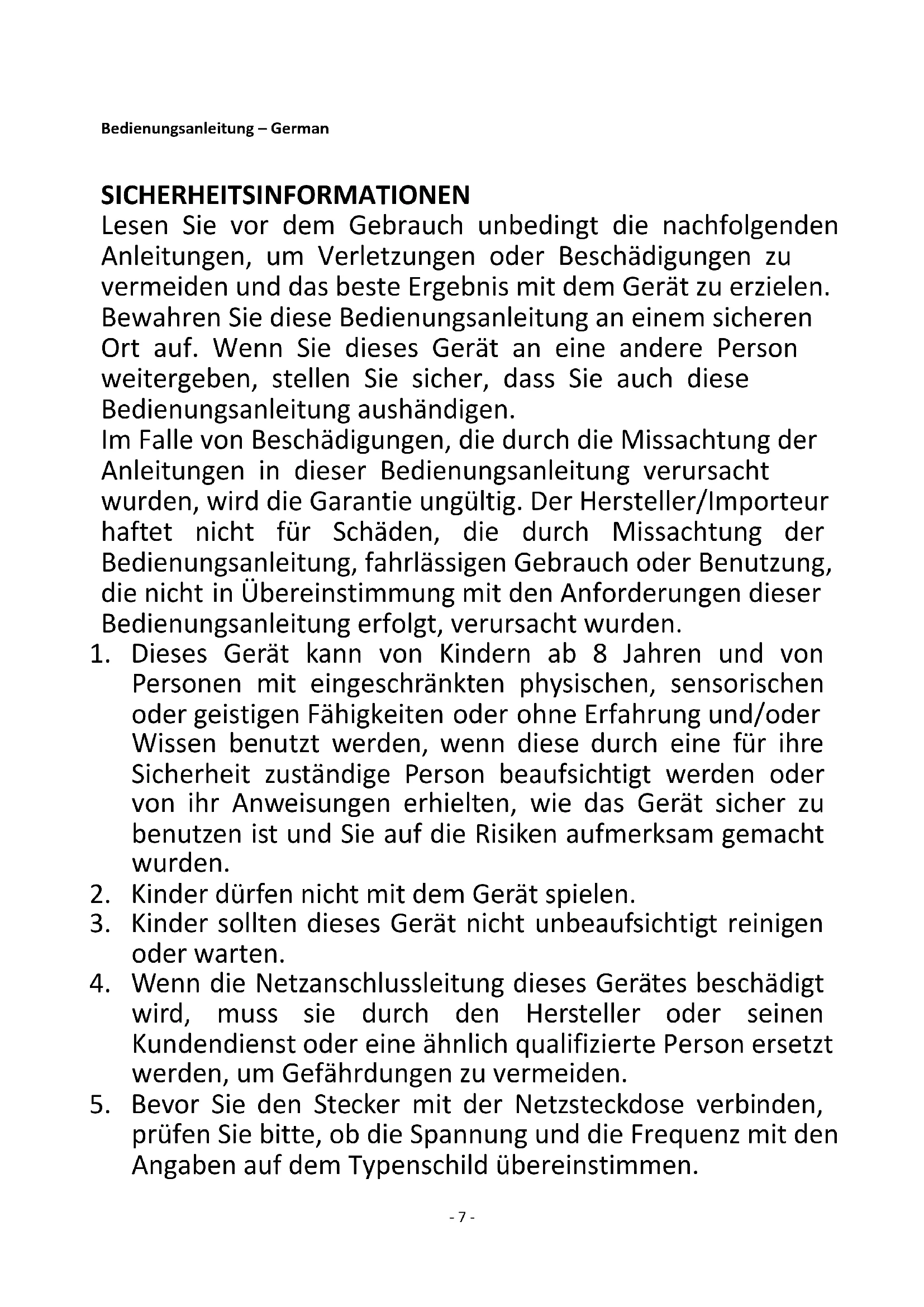 Regarding information for consumers on how to install, use and maintain the product, WEEE information, please check the instruction manual provided with packaging- 7 - Bedienungsanleitung – German SICHERHEITSINFORMATIONEN Lesen Sie vor dem Gebrauch unbedingt die nachfolgenden Anleitungen, um Verletzungen oder Beschädigungen zu vermeiden und das beste Ergebnis mit dem Gerät zu erzielen. Bewahren Sie diese Bedienungsanleitung an einem sicheren Ort auf. Wenn Sie dieses Gerät an eine andere Person weitergeben, stellen Sie sicher, dass Sie auch diese Bedienungsanleitung aushändigen. Im Falle von Beschädigungen, die durch die Missachtung der Anleitungen in dieser Bedienungsanleitung verursacht wurden, wird die Garantie ungültig. Der Hersteller/Importeur haftet nicht für Schäden, die durch Missachtung der Bedienungsanleitung, fahrlässigen Gebrauch oder Benutzung, die nicht in Übereinstimmung mit den Anforderungen dieser Bedienungsanleitung erfolgt, verursacht wurden.