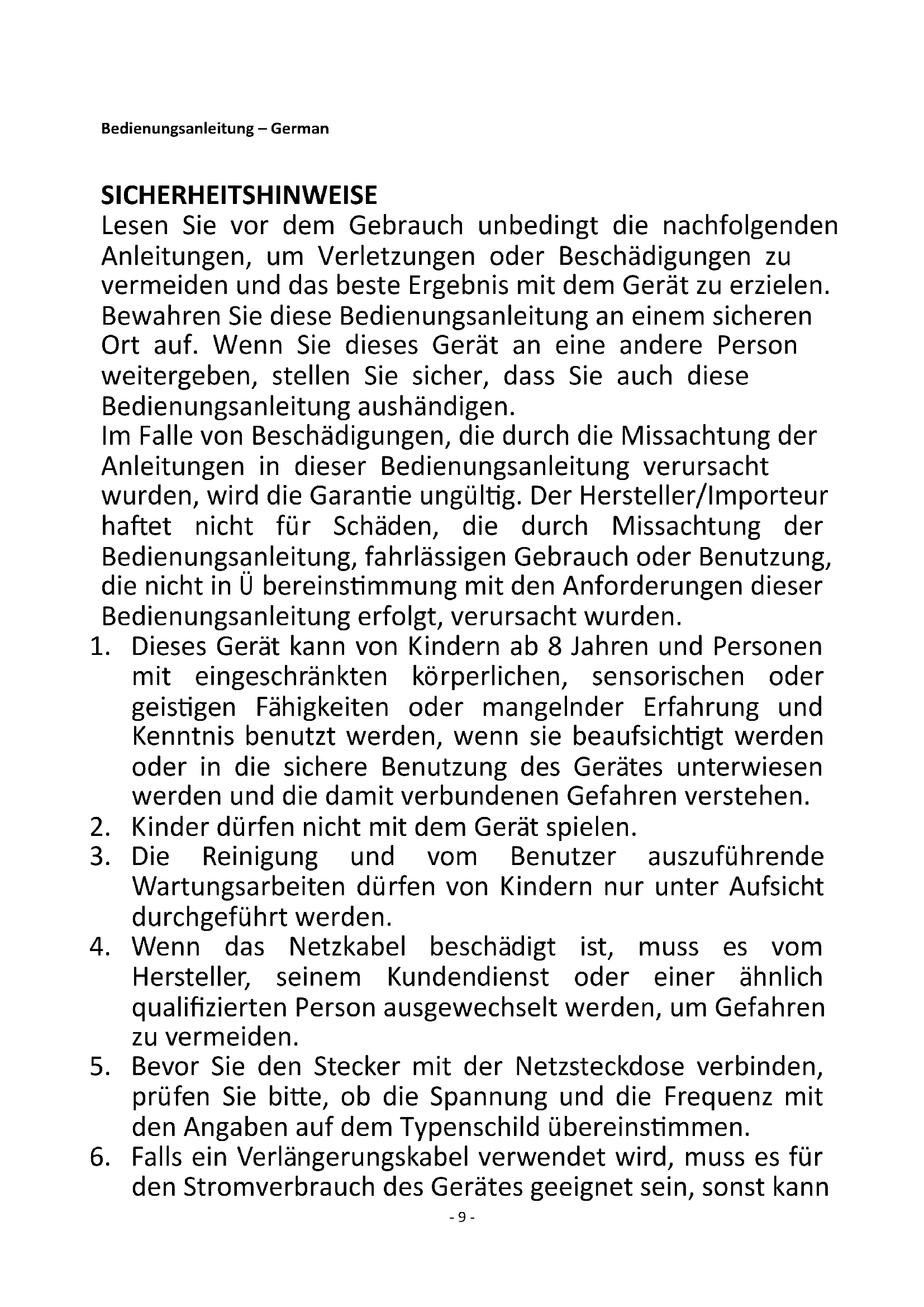 Regarding information for consumers on how to install, use and maintain the product, WEEE information, please check the instruction manual provided with packaging.- 9 - Bedienungsanleitung – German SICHERHEITSHINWEISE Lesen Sie vor dem Gebrauch unbedingt die nachfolgenden Anleitungen, um Verletzungen oder Beschädigungen zu vermeiden und das beste Ergebnis mit dem Gerät zu erzielen. Bewahren Sie diese Bedienungsanleitung an einem sicheren Ort auf. Wenn Sie dieses Gerät an eine andere Person weitergeben, stellen Sie sicher, dass Sie auch diese Bedienungsanleitung aushändigen. Im Falle von Beschädigungen, die durch die Missachtung der Anleitungen in dieser Bedienungsanleitung verursacht wurden, wird die Garantie ungültig. Der Hersteller/Importeur haftet nicht für Schäden, die durch Missachtung der Bedienungsanleitung, fahrlässigen Gebrauch oder Benutzung, die nicht in Übereinstimmung mit den Anforderungen dieser Bedienungsanleitung erfolgt, verursacht wurden.