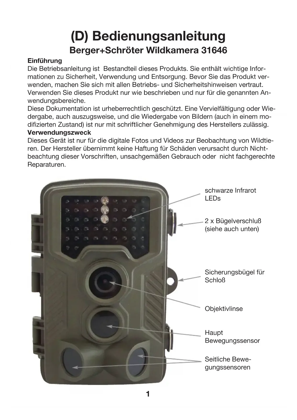(D) Bedienungsanleitung Berger+Schröter Wildkamera 31646 Einführung Die Betriebsanleitung ist Bestandteil dieses Produkts. Sie enthält wichtige Infor- mationen zu Sicherheit, Verwendung und Entsorgung. Bevor Sie das Produkt ver- wenden, machen Sie sich mit allen Betriebs- und Sicherheitshinweisen vertraut. Verwenden Sie dieses Produkt nur wie beschrieben und nur für die genannten An- wendungsbereiche. Diese Dokumentation ist urheberrechtlich geschützt. Eine Vervielfältigung oder Wie- dergabe, auch auszugsweise, und die Wiedergabe von Bildern (auch in einem mo- difizierten Zustand) ist nur mit schriftlicher Genehmigung des Herstellers zulässig. Verwendungszweck Dieses Gerät ist nur für die digitale Fotos und Videos zur Beobachtung von Wildtie- ren. Der Hersteller übernimmt keine Haftung für Schäden verursacht durch Nicht- beachtung dieser Vorschriften, unsachgemäßen Gebrauch oder nicht fachgerechte Reparaturen. schwarze Infrarot LEDs Haupt Bewegungssensor Seitliche Bewe- gungssensoren Objektivlinse Sicherungsbügel für Schloß 2 x Bügelverschluß (siehe auch unten)2 Steuerung Rauf Taste (Video Taste) Rechts Taste Shot Taste (manuelle sofortige Fotoauslösung) Ok Taste Menu Taste Links Taste Replay Taste (zum Anzeigen der Fotos oder Videos) Runter Taste (Foto Taste) Display Bildschirm TF Schlitz (für TF oder microSD Karten) AV Buchse USB Buchse EIN/Test/AUS Schalter: - Aus (OFF) - EIN (ON), - TEST (Test),3 Energieversorgung ♦ Um Batterien ins Gerät einzulegen, öff- nen Sie zunächst die beiden seitlichen Bügelverschlüsse und nehmen Sie die hintere Batteriefachplatte heraus. Mi- schen Sie keine alten und neuen Batterien zusammen. ♦ Legen Sie 4 x 1,5 V LR6 / AA-Batterien in das obere Batteriefach. Bitte achten Sie dabei auf die Polarität, entsprechend der Kennzeichnung. Um die Betriebszeit zu erhöhen, können Sie zusätzlich 4 x 1,5 V LR6 / AA-Batterien in das untere Batteriefach einsetzen. ♦ Schließen Sie den Deckel des Batteriefachs, bis die Abdeckung hörbar einras- tet. ♦ Wenn Sie das Gerät mit einem Netzteil betreiben wollen (nicht im Lieferumfang enthalten), öffnen Sie Rundgummidichtung auf der Unterseite der Kamera und ver- binden Sie den Stecker des Netzkabels mit der Buchse für das externes Netzteil. Der Netz-Adapter muss eine Gleichspannung von 6 V mit 680mA liefern. Der Stift in der Netzbuchse ist der Pluspol. Der Betrieb über ein Netzteil ist möglich, auch bei eingesetzten Batterien. Falls die Stromquelle ausfällt, wird der Betrieb über die Batterien fortgeführt.4 Video-Anschluss TV ♦ Die Kamera kann das Videosignal an einen externen Monitor übertragen oder an den Video-Eingang eines Fernsehgeräts. Bitte beachten Sie dabei auch den An- weisungen des jeweiligen Wiedergabegerätes. ♦ Schließen Sie einen geeigneten Monitor an der TV-Out-Buchse mit dem mitge- lieferten TV-Kabel an. Einfügen von Speichermedien ♦ Das Gerät unterstützt micro SD / SDHC-Speicherkarten, TF Karten mit einer Ka- pazität bis zu 32 GB. ♦ Schieben Sie die Speicherkarte wie durch das Symbol auf dem Steckplatz an- gezeigt ein. Niemals mit Gewalt die Speicherkarte in den Schlitz einschieben. ♦ Nach dem Transport der Speicherkarte, warten Sie, bis die Speicherkarte die Um- gebungstemperatur erreicht hat, bevor sie verwendet wird. Temperaturschwankun- gen oder Feuchtigkeit führen zu Kondensation, die einen elektrischen Kurzschluss verursachen kann. ♦ Um eine SD / SDHC-Speicherkarte aus dem Kartenschlitz zu entfernen, drücken Sie die vorstehende Kante der Speicherkarte ein wenig, bis sie herausspringt. Dann entfernen Sie die Karte. ♦ SD / SDHC-Speicherkarten verfügen über ein Verriegelungssystem um verse- hentliches Löschen zu verhindern. Auf der Seite der Karte befindet sich die Position "LOCK". Allerdings kann die Kamera nur Daten auf der Karte speichern, wenn die Karte nicht verriegelt ist. Handhabung und Bedienung Das Ein- und Ausschalten führen Sie mit dem Wahlschalter „Off Test On“ durch! Stellen Sie den Wahlschalter auf die "Test" Position, um die Einstellungen bzw. Pro- grammierung durchzuführen. ♦ Drücken Sie die Taste nach unten um von Video zu Foto-Modus zu wechseln Achtung! Die Kamera schaltet automatisch wieder in den Video Modus sobald Sie den Wahlschalter auf „Test“ stellen. Achten Sie auf die Anzeige im Bildschirm oben links! ♦ Drücken Sie die up-Taste um vom Foto wieder in den Videomodus zu wechseln. ♦ Drücken Sie die MENU-Taste, um das Einstellungsmenü zu öffnen. Nicht durch „OK“ bestätigte Änderungen werden nicht gespeichert! Drücken Sie die nach oben / unten Taste, um den gewünschten Menüeintrag zu wählen den Sie dann mit der OK-Taste aktivieren. Wenn Sie die Einstellung ändern, müssen Sie immer Ihre Änderungen mit "OK" bestätigen. Verwenden Sie die MENU-Taste durch nochmaliges Drücken um rückwärts in die vorherige Menüebene zu navigieren.5 Modus Um auszuwählen, ob Fotos oder Videos aufgezeichnet werden sollen wählen Sie „Foto“ oder „Video“ oder verwenden Sie ohne ins Menü zu gehen die rauf bzw. run- ter Taste und achten dabei auf die Anzeige im Display oben links. Achtung! Die Ka- mera schaltet automatisch wieder in den Video Modus sobald Sie den Wahlschalter wieder auf „Test“ stellen. Achten Sie auf die Anzeige im Bildschirm oben links!Im "Foto + Video" -Modus, der Kamera nimmt diese zuerst ein Foto auf und dann be- ginnt die Videoaufnahme. Sprache Hier können Sie einstellen, Englisch, Deutsch, Französisch, Italienisch, Niederlän- disch, Spanisch oder Portugiesisch. Speicherkarte formatieren die Funktion Speicherkarte Formatieren löscht alle Daten dauerhaft darauf. Bevor Sie eine neue Speicherkarte in der Kamera verwenden oder eine Karte, die in einem anderen Gerät verwendet wurde, sollten Sie zuerst die Speicherkarte formatieren. Wählen Sie "Ja" mit der OK-Taste, und bestätigen Sie die folgende Meldung mit OK. Der Formatierungsvorgang beginnt. Während die Karte formati