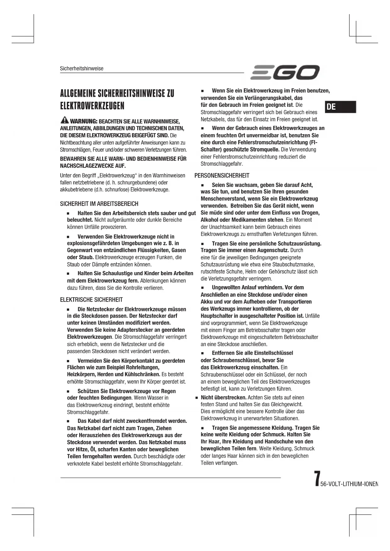 ◾ Halten Sie den Arbeitsbereich stets sauber und gut beleuchtet. Nicht aufgeräumte oder dunkle Bereiche können Unfälle provozieren. ◾ Verwenden Sie Elektrowerkzeuge nicht in explosionsgefährdeten Umgebungen wie z. B. in Gegenwart von entzündlichen Flüssigkeiten, Gasen oder Staub. Elektrowerkzeuge erzeugen Funken, die Staub oder Dämpfe entzünden können. ◾ Halten Sie Schaulustige und Kinder beim Arbeiten mit dem Elektrowerkzeug fern. Ablenkungen können dazu führen, dass Sie die Kontrolle verlieren. ELEKTRISCHE SICHERHEIT ◾ Die Netzstecker der Elektrowerkzeuge müssen in die Steckdosen passen. Der Netzstecker darf unter keinen Umständen modiziert werden. Verwenden Sie keine Adapterstecker an geerdeten Elektrowerkzeugen. Die Stromschlaggefahr verringert sich erheblich, wenn die Netzstecker und die passenden Steckdosen nicht verändert werden. ◾ Vermeiden Sie den Körperkontakt zu geerdeten Flächen wie zum Beispiel Rohrleitungen, Heizkörpern, Herden und Kühlschränken. Es besteht erhöhte Stromschlaggefahr, wenn Ihr Körper geerdet ist. ◾ Schützen Sie Elektrowerkzeuge vor Regen oder feuchten Bedingungen. Wenn Wasser in das Elektrowerkzeug eindringt, besteht erhöhte Stromschlaggefahr. ◾ Das Kabel darf nicht zweckentfremdet werden. Das Netzkabel darf nicht zum Tragen, Ziehen oder Herausziehen des Elektrowerkzeugs aus der Steckdose verwendet werden. Das Netzkabel muss vor Hitze, Öl, scharfen Kanten oder beweglichen Teilen ferngehalten werden. Durch beschädigte oder verknotete Kabel besteht erhöhte Stromschlaggefahr. ◾ Wenn Sie ein Elektrowerkzeug im Freien benutzen, verwenden Sie ein Verlängerungskabel, das für den Gebrauch im Freien geeignet ist. Die Stromschlaggefahr verringert sich bei Gebrauch eines Netzkabels, das für den Einsatz im Freien geeignet ist. ◾ Wenn der Gebrauch eines Elektrowerkzeuges an einem feuchten Ort unvermeidbar ist, benutzen Sie eine durch eine Fehlerstromschutzeinrichtung (FI-Schalter) geschützte Stromquelle. Die Verwendung einer Fehlerstromschutzeinrichtung reduziert die Stromschlaggefahr. PERSONENSICHERHEIT ◾ Seien Sie wachsam, geben Sie darauf Acht, was Sie tun, und benutzen Sie Ihren gesunden Menschenverstand, wenn Sie ein Elektrowerkzeug verwenden. Betreiben Sie das Gerät nicht, wenn Sie müde sind oder unter dem Einuss von Drogen, Alkohol oder Medikamenten stehen. Ein Moment der Unachtsamkeit kann beim Gebrauch eines Elektrowerkzeugs zu ernsthaften Verletzungen führen. ◾ Tragen Sie eine persönliche Schutzausrüstung. Tragen Sie immer einen Augenschutz. Durch eine für die jeweiligen Bedingungen geeignete Schutzausrüstung wie etwa eine Staubschutzmaske, rutschfeste Schuhe, Helm oder Gehörschutz lässt sich die Verletzungsgefahr verringern. ◾ Ungewollten Anlauf verhindern. Vor dem Anschließen an eine Steckdose und/oder einen Akku und vor dem Aufheben oder Transportieren des Werkzeugs immer kontrollieren, ob der Hauptschalter in ausgeschalteter Position ist. Unfälle sind vorprogrammiert, wenn Sie Elektrowerkzeuge mit einem Finger am Betriebsschalter tragen oder Elektrowerkzeuge mit eingeschaltetem Betriebsschalter an eine Steckdose anschließen. ◾ Entfernen Sie alle Einstellschlüssel oder Schraubenschlüssel, bevor Sie das Elektrowerkzeug einschalten. Ein Schraubenschlüssel oder ein Schlüssel, der noch an einem beweglichen Teil des Elektrowerkzeuges befestigt ist, kann zu Verletzungen führen. ◾ Nicht überstrecken. Achten Sie stets auf einen festen Stand und halten Sie das Gleichgewicht. Dies ermöglicht eine bessere Kontrolle über das Elektrowerkzeug in unerwarteten Situationen. ◾ Tragen Sie angemessene Kleidung. Tragen Sie keine weite Kleidung oder Schmuck. Halten Sie Ihr Haar, Ihre Kleidung und Handschuhe von den beweglichen Teilen fern. Weite Kleidung, Schmuck oder langes Haar können sich in den beweglichen Teilen verfangen.Sicherheitshinweise8 56-VOLT-LITHIUM-IONEN-AKKU-RASENMÄHER