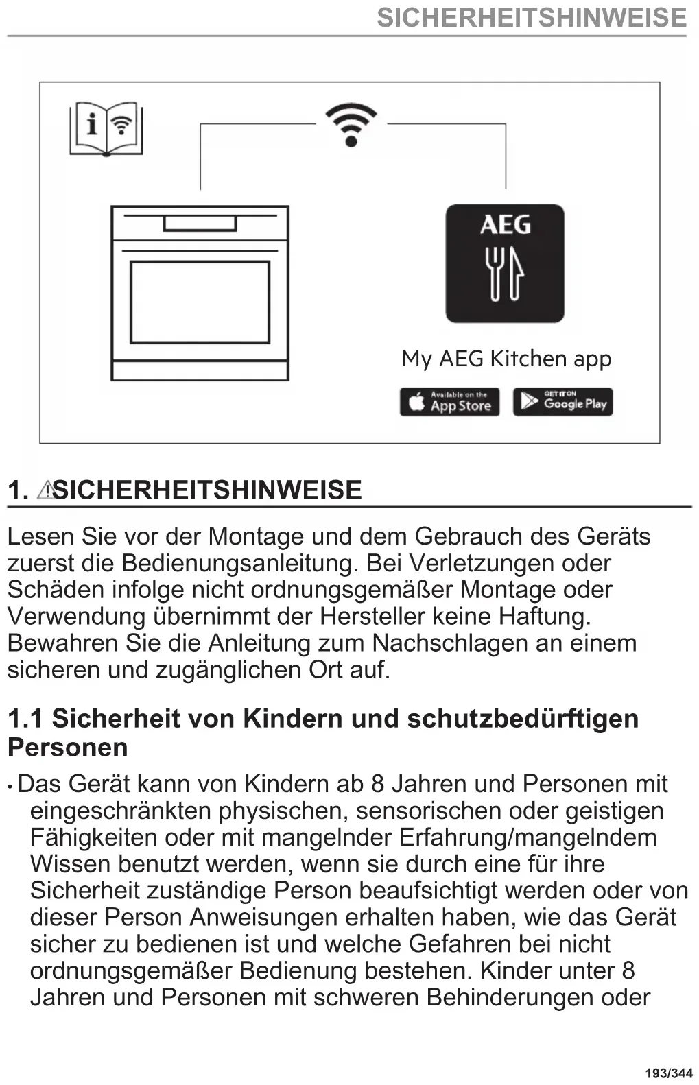 - Kinder sollten beaufsichtigt werden, um sicherzustellen, dass sie nicht mit dem Gerät und mit Mobilgeräten über My AEG Kitchen spielen.