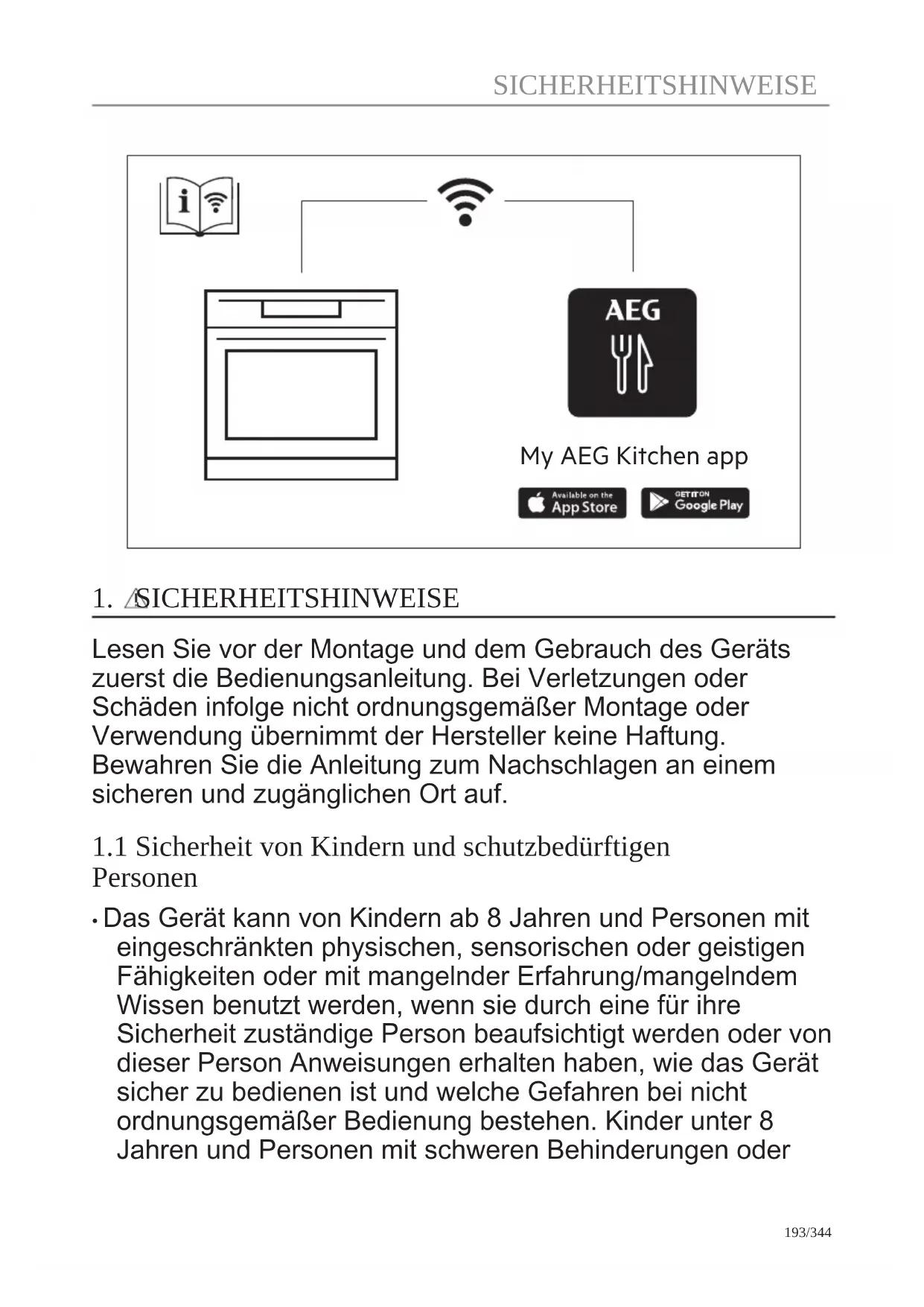 - Kinder sollten beaufsichtigt werden, um sicherzustellen, dass sie nicht mit dem Gerät und mit Mobilgeräten über My AEG Kitchen spielen.