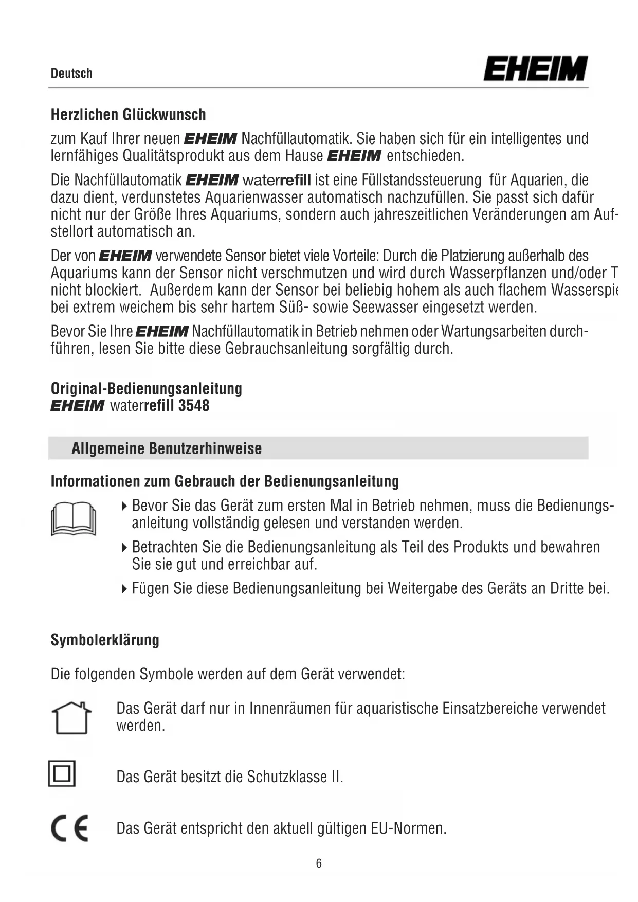 Allgemeine Benutzerhinweise Informationen zum Gebrauch der Bedienungsanleitung 4Bevor Sie das Gerät zum ersten Mal in Betrieb nehmen, muss die Bedienungs- anleitung vollständig gelesen und verstanden werden. 4Betrachten Sie die Bedienungsanleitung als Teil des Produkts und bewahren Sie sie gut und erreichbar auf. 4Fügen Sie diese Bedienungsanleitung bei Weitergabe des Geräts an Dritte bei. Symbolerklärung Die folgenden Symbole werden auf dem Gerät verwendet: Das Gerät darf nur in Innenräumen für aquaristische Einsatzbereiche verwendet werden. Das Gerät besitzt die Schutzklasse II. Das Gerät entspricht den aktuell gültigen EU-Normen. Original-Bedienungsanleitung EHEIM waterrefill 3548 DeutschDie folgenden Symbole und Signalworte werden in dieser Bedienungsanleitung verwendet: GEFAHR! Das Symbol weist auf eine drohende Gefahr durch Stromschlag hin, die den Tod oder eine schwere Körperverletzung zur Folge haben kann. GEFAHR! Das Symbol weist auf eine drohende Gefahr hin, die den Tod oder eine schwe- re Körperverletzung zur Folge haben kann. WARNUNG! Das Symbol weist auf eine drohende Gefahr hin, die eine mittlere bis leichte Körperverletzung oder ein gesundheitliches Risiko zur Folge haben kann. VORSICHT! Das Symbol weist auf die Gefahr von Sachschäden hin. Hinweis mit nützlichen Informationen und Tipps. Darstellungskonvention: A Verweis auf eine Abbildung, hier Verweis auf Abbildung A. Sie werden zu einer Handlung aufgefordert. Einsatzgebiet Das Gerät und alle im Lieferumfang enthaltenen Teile sind fur die Benutzung im privaten Bereich bestimmt und dürfen ausschließlich verwendet werden: