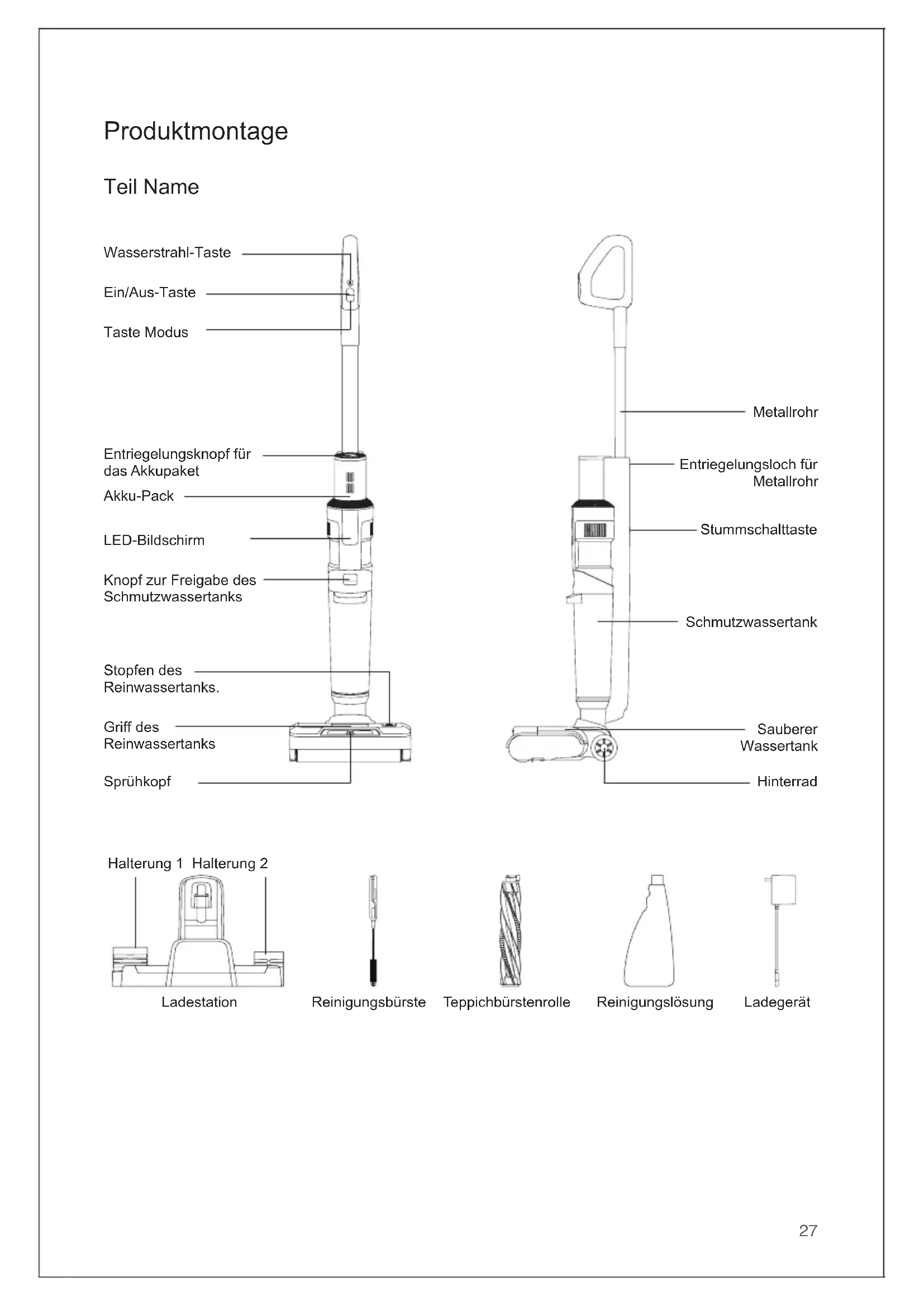 Może ulec zmianie bez powiadomienia.27 Produktmontage Teil Name Wasserstrahl-Taste Ein/Aus-Taste Entriegelungsknopf für das Akkupaket Metallrohr Entriegelungsloch für Metallrohr Stummschalttaste Schmutzwassertank Sauberer Wassertank Hinterrad Akku-Pack LED-Bildschirm Knopf zur Freigabe des Schmutzwassertanks Stopfen des Reinwassertanks. Griff des Reinwassertanks Sprühkopf Taste Modus Reinigungsbürste Ladestation Teppichbürstenrolle LadegerätReinigungslösung Halterung 1 Halterung 228 Packliste Teil Name Metallrohr Montage Montage der Bodenplatte Akku-Pack Ladestation Ladegerät Teppichb- ürstenrolle Menge 1 1 1 1 1 1 Teil Name Gebrauchsa- nweisung Reinigung- slösung Reinigung- sbürste Halterung 1 Halterung 2 Schmutz- wassertank Menge 1 1 1 1 1 1