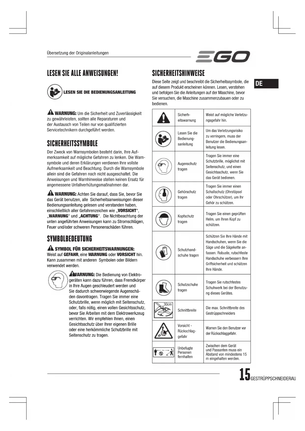 WARNUNG: Um die Sicherheit und Zuverlässigkeit zu gewährleisten, sollten alle Reparaturen und der Austausch von Teilen nur von qualizierten Servicetechnikern durchgeführt werden. SICHERHEITSSYMBOLE Der Zweck von Warnsymbolen besteht darin, Ihre Auf- merksamkeit auf mögliche Gefahren zu lenken. Die Warn- symbole und deren Erklärungen verdienen Ihre vollste Aufmerksamkeit und Beachtung. Durch die Warnsymbole allein sind die Gefahren noch nicht ausgeschaltet. Die Anweisungen und Warnhinweise stellen keinen Ersatz für angemessene Unfallverhütungsmaßnahmen dar. WARNUNG: Achten Sie darauf, dass Sie, bevor Sie das Gerät benutzen, alle Sicherheitsanweisungen dieser Bedienungsanleitung gelesen und verstanden haben, einschließlich aller Gefahrenzeichen wie „VORSICHT“, „WARNUNG“ und „ACHTUNG“. Die Nichtbeachtung der unten angeführten Anweisungen kann zu Stromschlägen, Feuer und/oder schweren Personenschäden führen. SYMBOLBEDEUTUNG SYMBOL FÜR SICHERHEITSWARNUNGEN: Weist auf GEFAHR, eine WARNUNG oder VORSICHT hin. Kann zusammen mit anderen Symbolen oder Bildern verwendet werden. WARNUNG: Die Bedienung von Elektro- geräten kann dazu führen, dass Fremdkörper in Ihre Augen geschleudert werden und Sie dadurch schwerwiegende Augenschä- den davontragen. Tragen Sie immer eine Schutzbrille, wenn möglich mit Seitenschutz, oder, falls nötig, einen vollen Gesichtsschutz, bevor Sie Arbeiten mit dem Elektrowerkzeug verrichten. Wir empfehlen Ihnen, einen Gesichtsschutz über Ihrer eigenen Brille oder eine herkömmliche Schutzbrille mit Seitenschutz zu tragen. SICHERHEITSHINWEISE Diese Seite zeigt und beschreibt die Sicherheitssymbole, die auf diesem Produkt erscheinen können. Lesen, verstehen und befolgen Sie die Anleitungen auf der Maschine, bevor Sie versuchen, die Maschine zusammenzubauen oder zu bedienen. Sicherh- eitswarnungWeist auf mögliche Verletzu-ngsgefahr hin.Lesen Sie die Bedienung- sanleitungUm das Verletzungsrisiko zu verringern, muss der Benutzer die Bedienungsan-leitung lesen.Augenschutz tragenTragen Sie immer eine Schutzbrille, möglichst mit Seitenschutz, und einen Gesichtsschutz, wenn Sie das Gerät bedienen.Gehörschutz tragenTragen Sie immer einen Schallschutz (Ohrstöpsel oder Ohrschützer), um Ihr Gehör zu schützen.Kopfschutz tragenTragen Sie einen geprüften Helm, um Ihren Kopf zu schützen.Schutzhand-schuhe tragenSchützen Sie Ihre Hände mit Handschuhen, wenn Sie die Säge und die Sägekette an-fassen. Robuste, rutschfeste Handschuhe verbessern Ihre Griffsicherheit und schützen Ihre Hände.Schutzschuhe tragenTragen Sie rutschfestes Schuhwerk bei der Benutzu-ng dieses Gerätes. 30cm SchnittbreiteDie max. Schnittbreite des GestrüppschneidersVorsicht - Rückschlag- gefahrWarnen Sie den Benutzer vor der Rückschlaggefahr. Unbefugte Personen fernhaltenZwischen dem Gerät und Passanten muss ein Abstand von mindestens 15 m eingehalten werden. Übersetzung der Originalanleitungen16 GESTRÜPPSCHNEIDERAUFSATZ — BCA1200