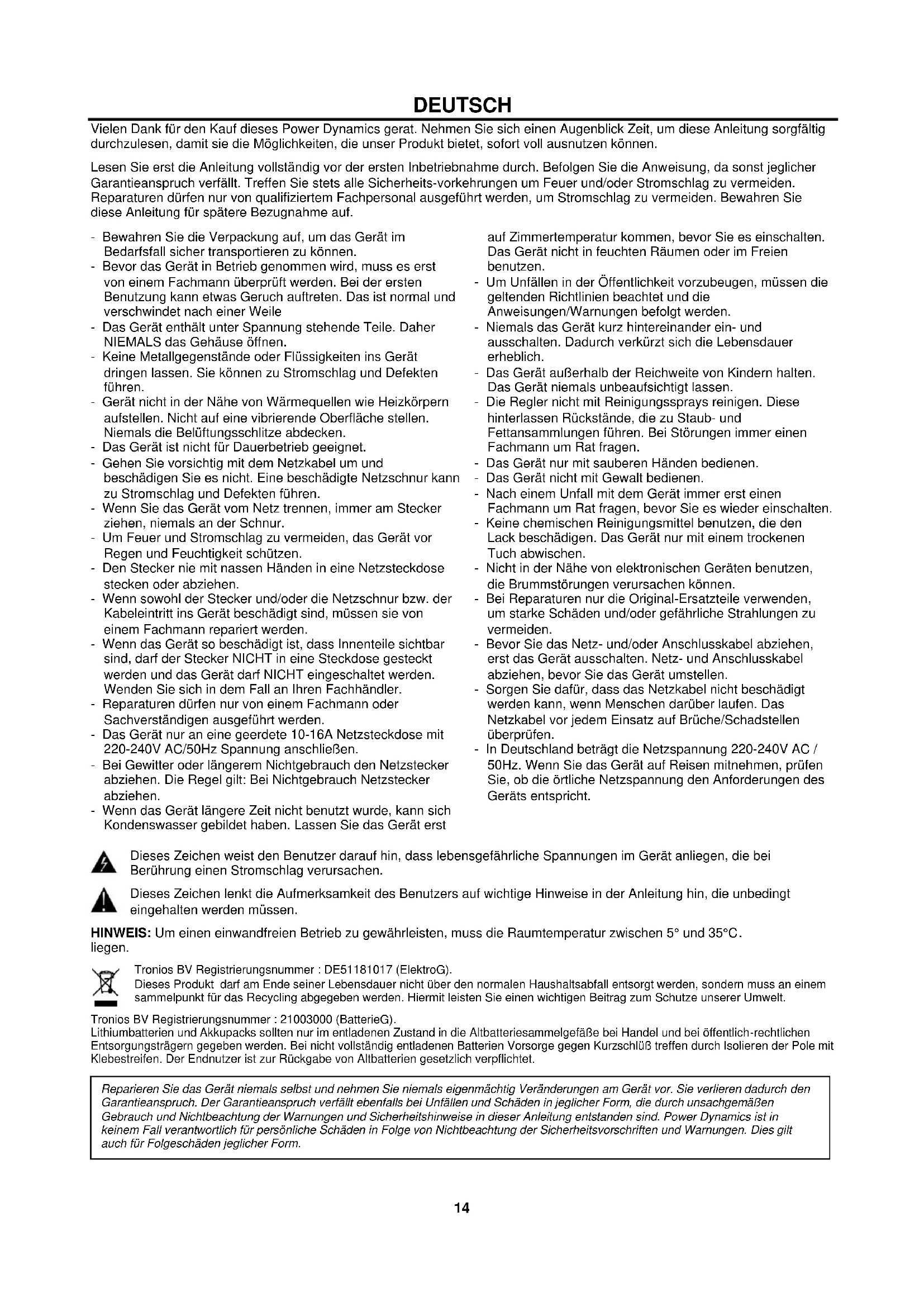 Zorg er bij het verbinden met- en het gebruiken van BT voor dat de BT-antenne in een verticale positie is om het best mogelijke draadloze signaal te verzekeren.14 DEUTSCH Vielen Dank für den Kauf dieses Power Dynamics gerat. Nehmen Sie sich einen Augenblick Zeit, um diese Anleitung sorgfältig durchzulesen, damit sie die Möglichkeiten, die unser Produkt bietet, sofort voll ausnutzen können. Lesen Sie erst die Anleitung vollständig vor der ersten Inbetriebnahme durch. Befolgen Sie die Anweisung, da sonst jeglicher Garantieanspruch verfällt. Treffen Sie stets alle Sicherheits-vorkehrungen um Feuer und/oder Stromschlag zu vermeiden. Reparaturen dürfen nur von qualifiziertem Fachpersonal ausgeführt werden, um Stromschlag zu vermeiden. Bewahren Sie diese Anleitung für spätere Bezugnahme auf. - Bewahren Sie die Verpackung auf, um das Gerät im Bedarfsfall sicher transportieren zu können. - Bevor das Gerät in Betrieb genommen wird, muss es erst von einem Fachmann überprüft werden. Bei der ersten Benutzung kann etwas Geruch auftreten. Das ist normal und verschwindet nach einer Weile - Das Gerät enthält unter Spannung stehende Teile. Daher NIEMALS das Gehäuse öffnen. - Keine Metallgegenstände oder Flüssigkeiten ins Gerät dringen lassen. Sie können zu Stromschlag und Defekten führen. - Gerät nicht in der Nähe von Wärmequellen wie Heizkörpern aufstellen. Nicht auf eine vibrierende Oberfläche stellen. Niemals die Belüftungsschlitze abdecken. - Das Gerät ist nicht für Dauerbetrieb geeignet. - Gehen Sie vorsichtig mit dem Netzkabel um und beschädigen Sie es nicht. Eine beschädigte Netzschnur kann zu Stromschlag und Defekten führen. - Wenn Sie das Gerät vom Netz trennen, immer am Stecker ziehen, niemals an der Schnur. - Um Feuer und Stromschlag zu vermeiden, das Gerät vor Regen und Feuchtigkeit schützen. - Den Stecker nie mit nassen Händen in eine Netzsteckdose stecken oder abziehen. - Wenn sowohl der Stecker und/oder die Netzschnur bzw. der Kabeleintritt ins Gerät beschädigt sind, müssen sie von einem Fachmann repariert werden. - Wenn das Gerät so beschädigt ist, dass Innenteile sichtbar sind, darf der Stecker NICHT in eine Steckdose gesteckt werden und das Gerät darf NICHT eingeschaltet werden. Wenden Sie sich in dem Fall an Ihren Fachhändler. - Reparaturen dürfen nur von einem Fachmann oder Sachverständigen ausgeführt werden. - Das Gerät nur an eine geerdete 10-16A Netzsteckdose mit 220-240V AC/50Hz Spannung anschließen. - Bei Gewitter oder längerem Nichtgebrauch den Netzstecker abziehen. Die Regel gilt: Bei Nichtgebrauch Netzstecker abziehen. - Wenn das Gerät längere Zeit nicht benutzt wurde, kann sich Kondenswasser gebildet haben. Lassen Sie das Gerät erst auf Zimmertemperatur kommen, bevor Sie es einschalten. Das Gerät nicht in feuchten Räumen oder im Freien benutzen. - Um Unfällen in der Öffentlichkeit vorzubeugen, müssen die geltenden Richtlinien beachtet und die Anweisungen/Warnungen befolgt werden. - Niemals das Gerät kurz hintereinander ein- und ausschalten. Dadurch verkürzt sich die Lebensdauer erheblich. - Das Gerät außerhalb der Reichweite von Kindern halten. Das Gerät niemals unbeaufsichtigt lassen. - Die Regler nicht mit Reinigungssprays reinigen. Diese hinterlassen Rückstände, die zu Staub- und Fettansammlungen führen. Bei Störungen immer einen Fachmann um Rat fragen. - Das Gerät nur mit sauberen Händen bedienen. - Das Gerät nicht mit Gewalt bedienen. - Nach einem Unfall mit dem Gerät immer erst einen Fachmann um Rat fragen, bevor Sie es wieder einschalten. - Keine chemischen Reinigungsmittel benutzen, die den Lack beschädigen. Das Gerät nur mit einem trockenen Tuch abwischen. - Nicht in der Nähe von elektronischen Geräten benutzen, die Brummstörungen verursachen können. - Bei Reparaturen nur die Original-Ersatzteile verwenden, um starke Schäden und/oder gefährliche Strahlungen zu vermeiden. - Bevor Sie das Netz- und/oder Anschlusskabel abziehen, erst das Gerät ausschalten. Netz- und Anschlusskabel abziehen, bevor Sie das Gerät umstellen. - Sorgen Sie dafür, dass das Netzkabel nicht beschädigt werden kann, wenn Menschen darüber laufen. Das Netzkabel vor jedem Einsatz auf Brüche/Schadstellen überprüfen. - In Deutschland beträgt die Netzspannung 220-240V AC / 50Hz. Wenn Sie das Gerät auf Reisen mitnehmen, prüfen Sie, ob die örtliche Netzspannung den Anforderungen des Geräts entspricht. Dieses Zeichen weist den Benutzer darauf hin, dass lebensgefährliche Spannungen im Gerät anliegen, die bei Berührung einen Stromschlag verursachen. Dieses Zeichen lenkt die Aufmerksamkeit des Benutzers auf wichtige Hinweise in der Anleitung hin, die unbedingt eingehalten werden müssen. HINWEIS: Um einen einwandfreien Betrieb zu gewährleisten, muss die Raumtemperatur zwischen 5° und 35°C. liegen. Tronios BV Registrierungsnummer : DE51181017 (ElektroG). Dieses Produkt darf am Ende seiner Lebensdauer nicht über den normalen Haushaltsabfall entsorgt werden, sondern muss an einem sammelpunkt für das Recycling abgegeben werden. Hiermit leisten Sie einen wichtigen Beitrag zum Schutze unserer Umwelt. Tronios BV Registrierungsnummer : 21003000 (BatterieG). Lithiumbatterien und Akkupacks sollten nur im entladenen Zustand in die Altbatteriesammelgefäße bei Handel und bei öffentlich-rechtlichen Entsorgungsträgern gegeben werden. Bei nicht vollständig entladenen Batterien Vorsorge gegen Kurzschlüß treffen durch Isolieren der Pole mit Klebestreifen. Der Endnutzer ist zur Rückgabe von Altbatterien gesetzlich verpflichtet.