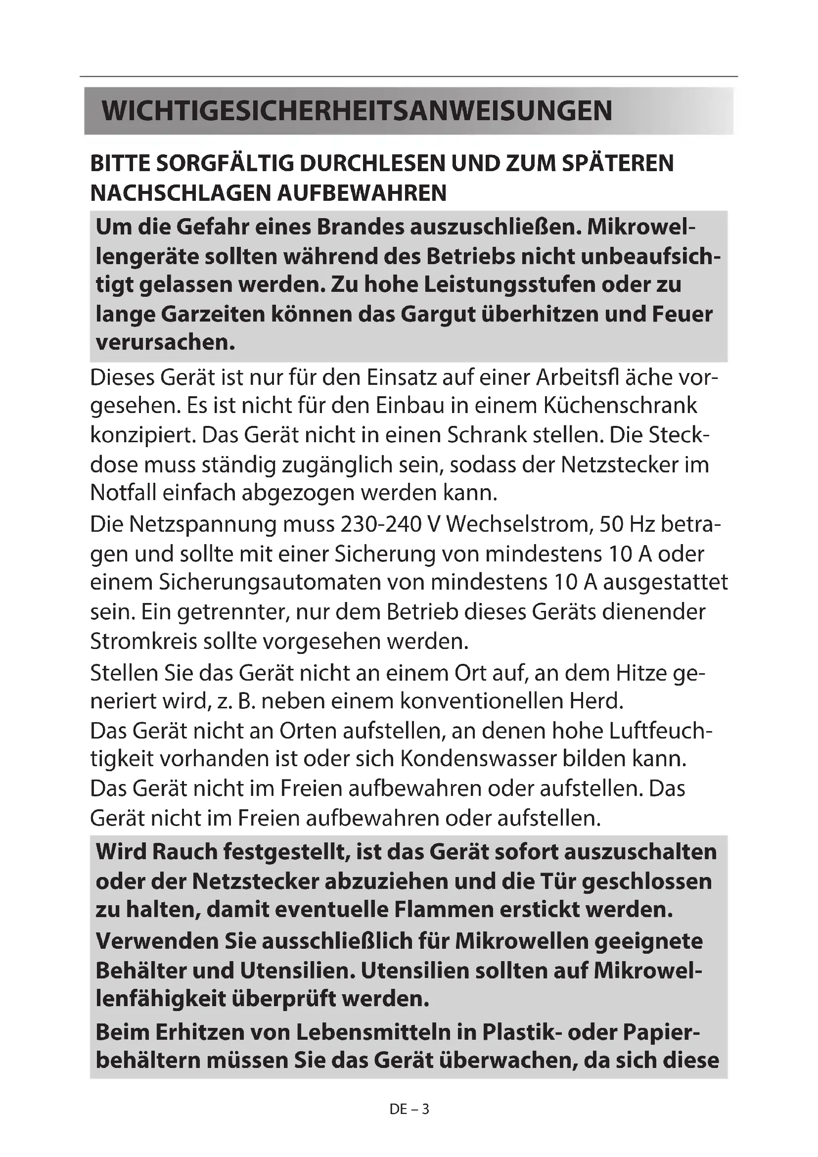 - EHE SIE UNTERSTÜTZUNG ANFORDERN DE – 3 DE – 3 WICHTIGE SICHERHEITSANWEISUNGEN BITTE SORGFÄLTIG DURCHLESEN UND ZUM SPÄTEREN NACHSCHLAGEN AUFBEWAHREN Um die Gefahr eines Brandes auszuschließen. Mikrowel- lengeräte sollten während des Betriebs nicht unbeaufsich- tigt gelassen werden. Zu hohe Leistungsstufen oder zu lange Garzeiten können das Gargut überhitzen und Feuer verursachen. Dieses Gerät ist nur für den Einsatz auf einer Arbeits äche vor- gesehen. Es ist nicht für den Einbau in einem Küchenschrank konzipiert. Das Gerät nicht in einen Schrank stellen. Die Steck- dose muss ständig zugänglich sein, sodass der Netzstecker im Notfall einfach abgezogen werden kann. Die Netzspannung muss 230-240 V Wechselstrom, 50 Hz betra- gen und sollte mit einer Sicherung von mindestens 10A oder einem Sicherungsautomaten von mindestens 10 A ausgestattet sein. Ein getrennter, nur dem Betrieb dieses Geräts dienender Stromkreis sollte vorgesehen werden. Stellen Sie das Gerät nicht an einem Ort auf, an dem Hitze ge- neriert wird, z. B. neben einem konventionellen Herd. Das Gerät nicht an Orten aufstellen, an denen hohe Luftfeuch- tigkeit vorhanden ist oder sich Kondenswasser bilden kann. Das Gerät nicht im Freien aufbewahren oder aufstellen. Das Gerät nicht im Freien aufbewahren oder aufstellen. Wird Rauch festgestellt, ist das Gerät sofort auszuschalten oder der Netzstecker abzuziehen und die Tür geschlossen zu halten, damit eventuelle Flammen erstickt werden. Verwenden Sie ausschließlich für Mikrowellen geeignete Behälter und Utensilien. Utensilien sollten auf Mikrowel- lenfähigkeit überprüft werden. Beim Erhitzen von Lebensmitteln in Plastik- oder Papier- behältern müssen Sie das Gerät überwachen, da sich dieseDE DE – 4 DE – 4 entzünden könnten. Reinigen Sie die Abdeckung des Hohlleiters und den Gar- raum. Sie müssen trocken und frei von Fett sein. Angesam- meltes Fett könnte sich überhitzen, zu rauchen anfangen oder Feuer fangen. Keine brennbaren Materialien in der Nähe desGerätes oder den Lüftungsö nungen aufbewahren. Niemals die Lüftungsö - nungen blockieren. Alle Metallverschlüsse, Drähte usw. von Lebensmitteln und Ver- packungen entfernen. Funkenbildung auf Metallober ächen kann zu Feuer führen. Das Mikrowellengerät nicht zum Frittierenvon Lebensmitteln in Öl oder Fett verwenden.Die Temperatur kann nicht kontrol- liert werden und das Fett kann sich entzünden. Zum Herstellen von Popcorn sollte nur fürMikrowellengeräte vorgesehenes Popcorn-Geschirr verwendet werden. Keine Lebensmittel oder andere Gegenstände im Gerät lagern. Die Einstellungen nach dem Starten des Gerätes überprüfen, um sicherzustellen, dass das Gerät wie gewünscht arbeitet. Lassen Sie den Ofen beim Betrieb nicht unbeaufsichtigt. Zur Vermeidung von Überhitzung und Feuer sollte besonders vorsichtig vorgegangen werden, wenn Lebensmittel mit einem besonders hohen Zucker- oder Fettgehalt gegart oder aufge- wärmt werden, z.B. Würstchen, Kuchen oder weihnachtliche Süßspeisen. Beachten Sie die entsprechenden Hinweise in dieser Bedienungsanleitung. Zur Vermeidung von Verletzungen. WARNUNG: Das Gerät nicht betreiben, wenn es beschädigt ist oder Fehl- funktionen aufweist. Überprüfen Sie vor dem Betrieb die folgenden Punkte: a) Vergewissern Sie sich, dass die Tür einwandfrei schließt und dass sie nicht falsch ausgerichtet oder verzogen ist. b) Vergewissern Sie sich, dass die Scharniere und Verriegelun-DE – 5 DE – 5 gen der Sicherheitstüren nicht beschädigt oder lose sind. c) Vergewissern Sie sich, dass die Türdichtungen und Dich- tungsober ächen nicht beschädigt sind. d) Vergewissern Sie sich, dass sich im Garraum und an der Tür keine Dellen oder andere Beschädigungen vorhanden sind. e) Vergewissern Sie sich, dass das Netzkabel und der Stecker nicht beschädigt sind. Falls die Tür bzw. die Türdichtungen beschädigt sind, darf das Gerät nicht weiter betrieben werden, bevor es durch eine kompetente Person repariert wurde. Nehmen Sie unter keinen Umständen Reparaturen oder Änderungen an Ihrem Mikrowellengerät selbst vor. Repa- raturen, insbesondere solche, bei denen die Abdeckung des Geräts entfernt werden muss, dürfen ausschließlich von entsprechend quali zierten Technikern vorgenom- men werden. Das Gerät nicht mit geö neter Türe betreiben oder verändern Sie die Türsicherheitsverriegelung in keiner Weise. Gerät nicht betreiben, wenn sich ein Objekt zwischen den Türdichtungen und den Dichtungsober ächen be ndet. Vermeiden Sie die Bildung von Schmutz oder Fett an Türdichtungen und angrenzenden Teilen. Reinigen Sie das Gerät in regelmäßigen Abständen und entfernen Sie Lebensmittelrückstände. Befolgen Sie die Hinweise im Kapitel „Reinigung und P ege“. Wird das Gerät nicht in einem sauberen Zustand gehalten, kann dies zu einer Beschädigung der Ober äche führen, was die Gebrauchsdauer des Gerätes nachteilig beein ussen und möglicherweise zu einer Gefahrensitua- tion führen kann. Personen mit HERZSCHRITTMACHERN sollten ihren Arzt oder den Hersteller des Herzschrittmachers nach Vorsichtsmaßnah-DE DE – 6 DE – 6 men beim Umgang mit Mikrowellengeräten befragen. Zur Vermeidung von Elektroschocks. p. 31