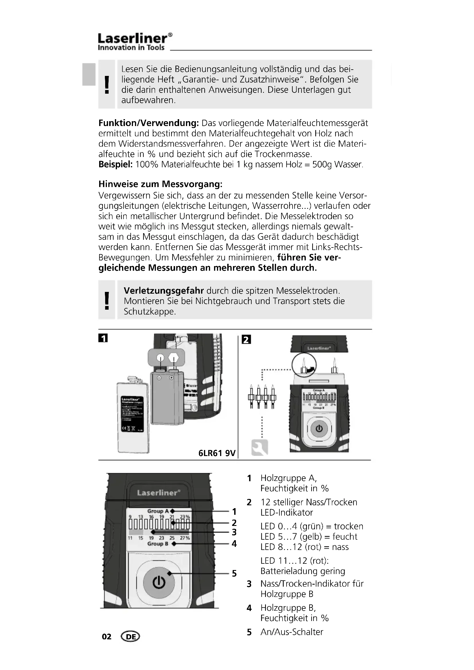 Auto-Hold-Funktion Nachdem das Gerät aus dem Messgut gezogen wird, wird automa- tisch der letzte Messwert für ca. 5 Sekunden gehalten. In diesem Zeit- raum blinken die LEDs und zeigen den zuletzt ermittelten Messwert an. Sobald die erste grüne LED wieder blinkt, ist das Gerät bereit für eine neue Messung. EU-Bestimmungen und Entsorgung Das Gerät erfüllt alle erforderlichen Normen für den freien Warenverkehr innerhalb der EU. Dieses Produkt ist ein Elektrogerät und muss nach der europäischen Richtlinie für Elektro- und Elektronik- Altgeräte getrennt gesammelt und entsorgt werden. Weitere Sicherheits- und Zusatzhinweise unter: www.laserliner.com/info Resistive Materialfeuchtemessung über integrierte Elektroden2 Holz-Skalen9% … 23%11%…27% ± 2% 22 °C0 °C…40°C-10 °C…70 °C 85% 1 x 6LR61 9Vca. 40 hMessprinzip MaterialMessbereich Holzgruppe AMessbereich Holzgruppe BGenauigkeitNenntemperaturZulässige Arbeitstemp. Zulässige Lagertemperatur Zulässige max Rel. LuftfeuchteSpannungsversorgung Batterielebensdauer Technische Daten Technische Änderungen vorbehalten. 01.15. Die Funktion und die Betriebssicherheit ist nur dann gewähr- l eistet, wenn das Messgerät im Rahmen der angebenen klima- tischen Bedingungen betrieben wird und nur für die Zwecke eingesetzt wird, für die es konstruiert wurde. Die Beurteilung der Messergebnisse und die daraus resultierenden Maßnah- men liegen in der Verantwortung des Anwenders, je nach der jeweiligen Arbeitsaufgabe. !06