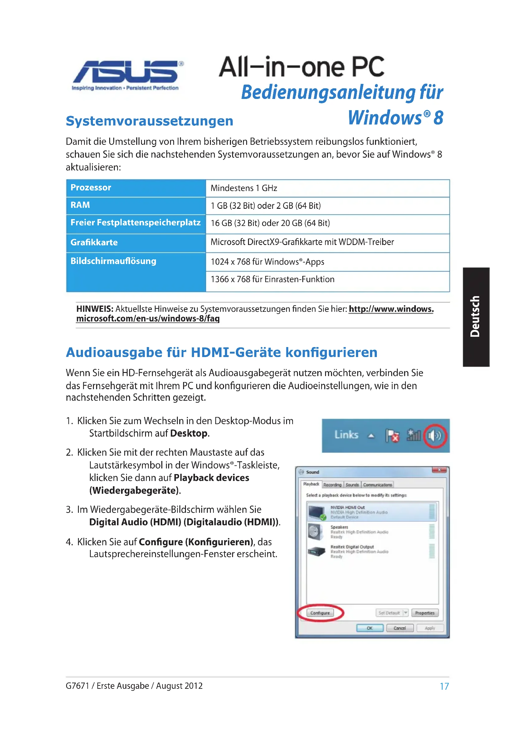 restauration.16 Français Français REMARQUE : téléchargez la version multilingue de ce guide sur le site Web d’ASUS : http://support.asus.com17 Bedienungsanleitung für Windows® 8 Audioausgabe für HDMI-Geräte kongurieren Wenn Sie ein HD-Fernsehgerät als Audioausgabegerät nutzen möchten, verbinden Sie das Fernsehgerät mit Ihrem PC und kongurieren die Audioeinstellungen, wie in den nachstehenden Schritten gezeigt.