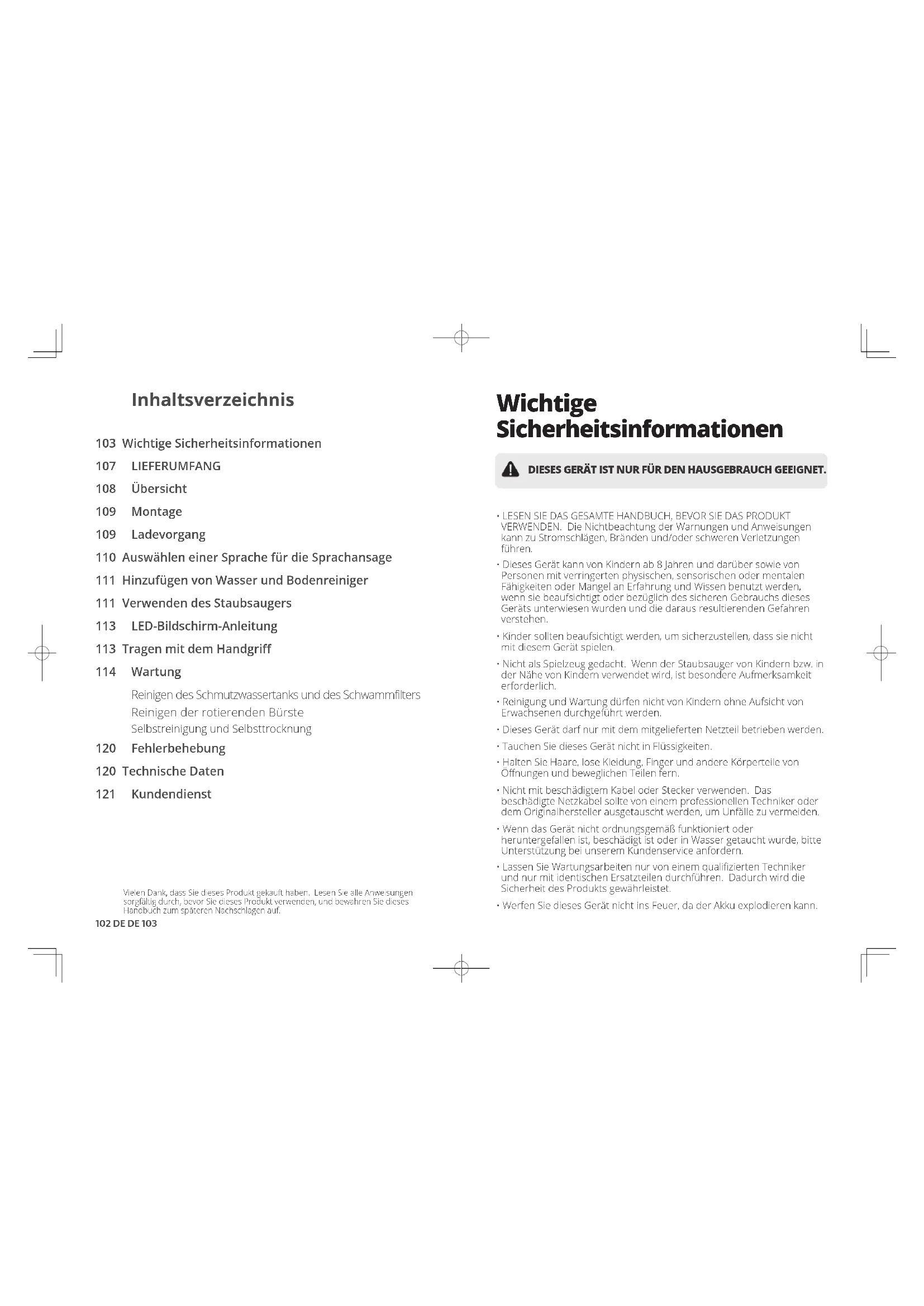 (US) +1 (800) 988 7973 Mon-Sat 6:15 AM - 6:45 PM (PT); Sun 6:15 AM - 5:45 PM (PT) (UK) +44 (0) 1604 936200 Mon-Sun 6:00 - 19:00 (DE) +49 (0) 69 9579 7960 Mo-Fr 8:00 - 16:00; Sa 9:00 - 16:00 (日本) 03 4455 7823 月 - 金 9:00 - 17:00 Ga voor meer telefoonnummers voor ondersteuning naar: https://support.eufylife.com/s/phonecontactus Of scan onderstaande QR-code:102 DE DE 103 Vielen Dank, dass Sie dieses Produkt gekauft haben. Lesen Sie alle Anweisungen sorgfältig durch, bevor Sie dieses Produkt verwenden, und bewahren Sie dieses Handbuch zum späteren Nachschlagen auf. Inhaltsverzeichnis 103 Wichtige Sicherheitsinformationen 107 LIEFERUMFANG 108 Übersicht 109 Montage 109 Ladevorgang 110 Auswählen einer Sprache für die Sprachansage 111 Hinzufügen von Wasser und Bodenreiniger 111 Verwenden des Staubsaugers 113 LED-Bildschirm-Anleitung 113 Tragen mit dem Handgriff 114 Wartung Reinigen des Schmutzwassertanks und des Schwammfilters Reinigen der rotierenden Bürste Selbstreinigung und Selbsttrocknung 120 Fehlerbehebung 120 Technische Daten 121 Kundendienst Wichtige Sicherheitsinformationen DIESES GERÄT IST NUR FÜR DEN HAUSGEBRAUCH GEEIGNET.