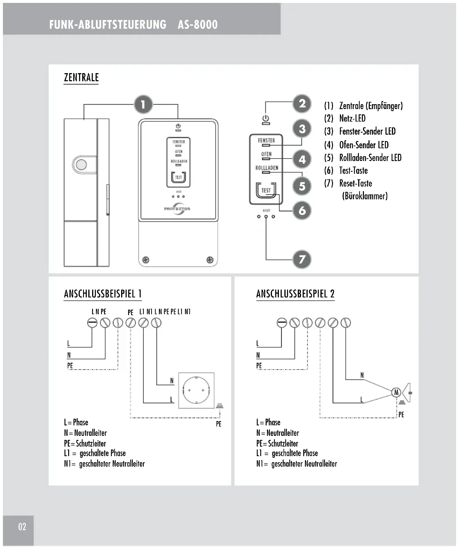 L = Phase N = Neutralleiter PE = Schutzleiter L1 = geschaltete Phase N1= geschalteter Neutralleiter ANSCHLUSSBEISPIEL 1 ANSCHLUSSBEISPIEL 2