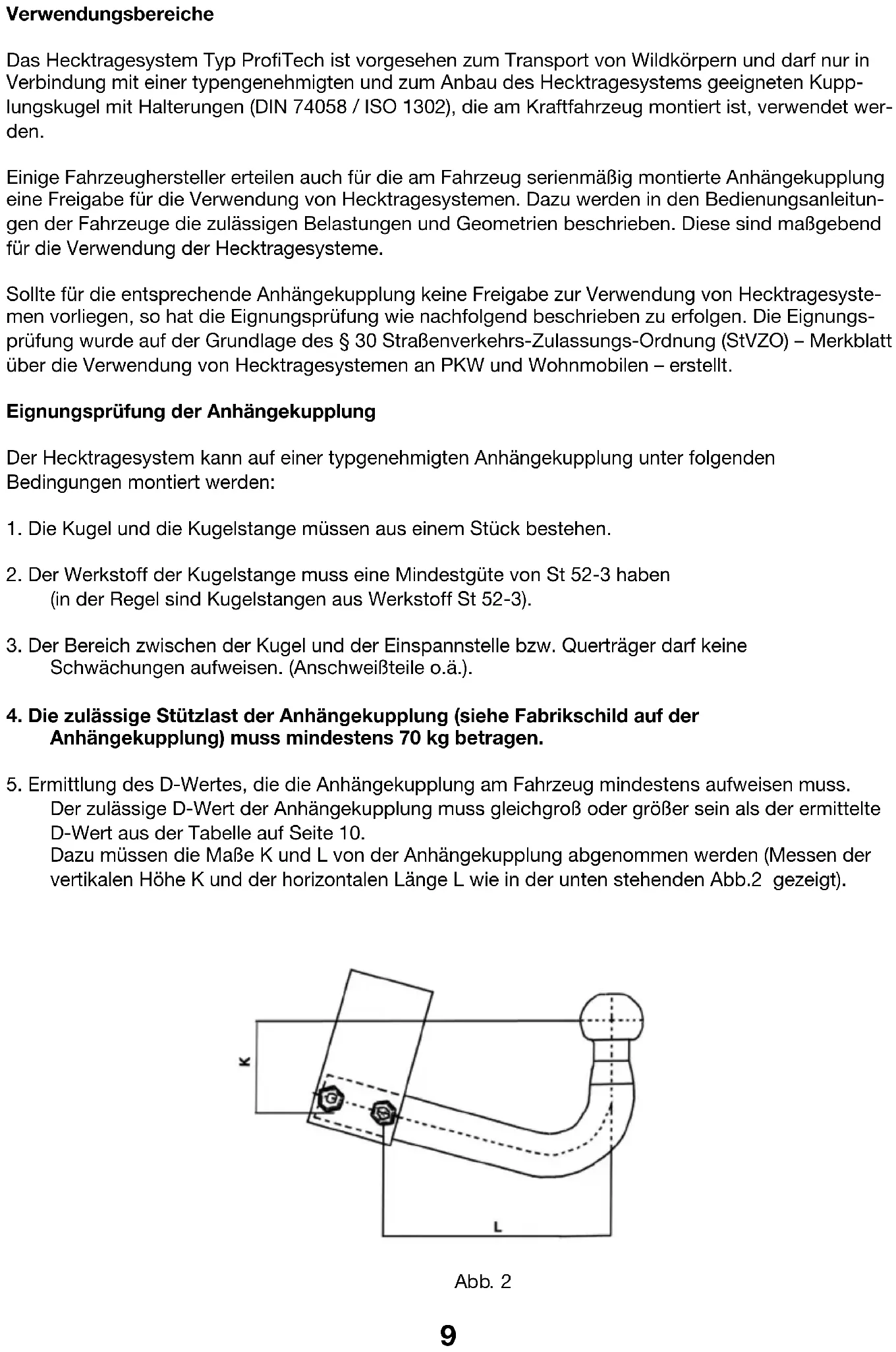 Nachfolgender DEKRA Prüfbericht gilt nur für die Ausführungen Art. Nr. 30726 und Art. Nr. 3114423456789 Verwendungsbereiche Das Hecktragesystem Typ ProfiTech ist vorgesehen zum Transport von Wildkörpern und darf nur in Verbindung mit einer typengenehmigten und zum Anbau des Hecktragesystems geeigneten Kupp- lungskugel mit Halterungen (DIN 74058 / ISO 1302), die am Kraftfahrzeug montiert ist, verwendet wer- den. Einige Fahrzeughersteller erteilen auch für die am Fahrzeug serienmäßig montierte Anhängekupplung eine Freigabe für die Verwendung von Hecktragesystemen. Dazu werden in den Bedienungsanleitun- gen der Fahrzeuge die zulässigen Belastungen und Geometrien beschrieben. Diese sind maßgebend für die Verwendung der Hecktragesysteme. Sollte für die entsprechende Anhängekupplung keine Freigabe zur Verwendung von Hecktragesyste- men vorliegen, so hat die Eignungsprüfung wie nachfolgend beschrieben zu erfolgen. Die Eignungs- prüfung wurde auf der Grundlage des § 30 Straßenverkehrs-Zulassungs-Ordnung (StVZO) – Merkblatt über die Verwendung von Hecktragesystemen an PKW und Wohnmobilen – erstellt. Eignungsprüfung der Anhängekupplung Der Hecktragesystem kann auf einer typgenehmigten Anhängekupplung unter folgenden Bedingungen montiert werden: