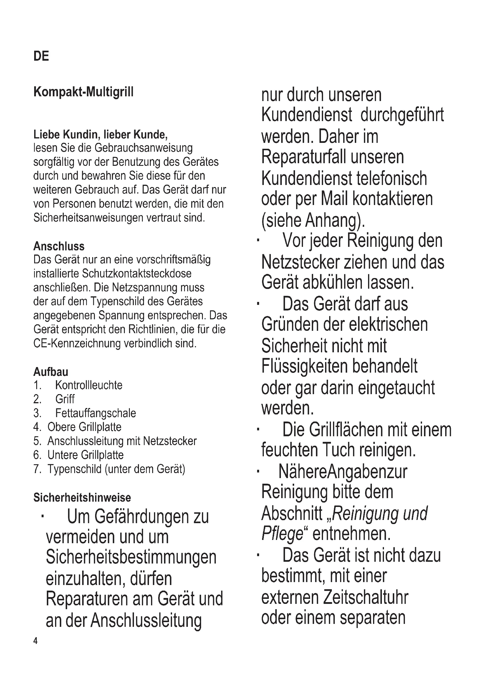 104 x 142 mm Kompakt-Multigrill Liebe Kundin, lieber Kunde, lesen Sie die Gebrauchsanweisung sorgfältig vor der Benutzung des Gerätes durch und bewahren Sie diese für den weiteren Gebrauch auf. Das Gerät darf nur von Personen benutzt werden, die mit den Sicherheitsanweisungen vertraut sind. Anschluss Das Gerät nur an eine vorschriftsmäßig installierte Schutzkontaktsteckdose anschließen. Die Netzspannung muss der auf dem Typenschild des Gerätes angegebenen Spannung entsprechen. Das Gerät entspricht den Richtlinien, die für die CE-Kennzeichnung verbindlich sind. Aufbau