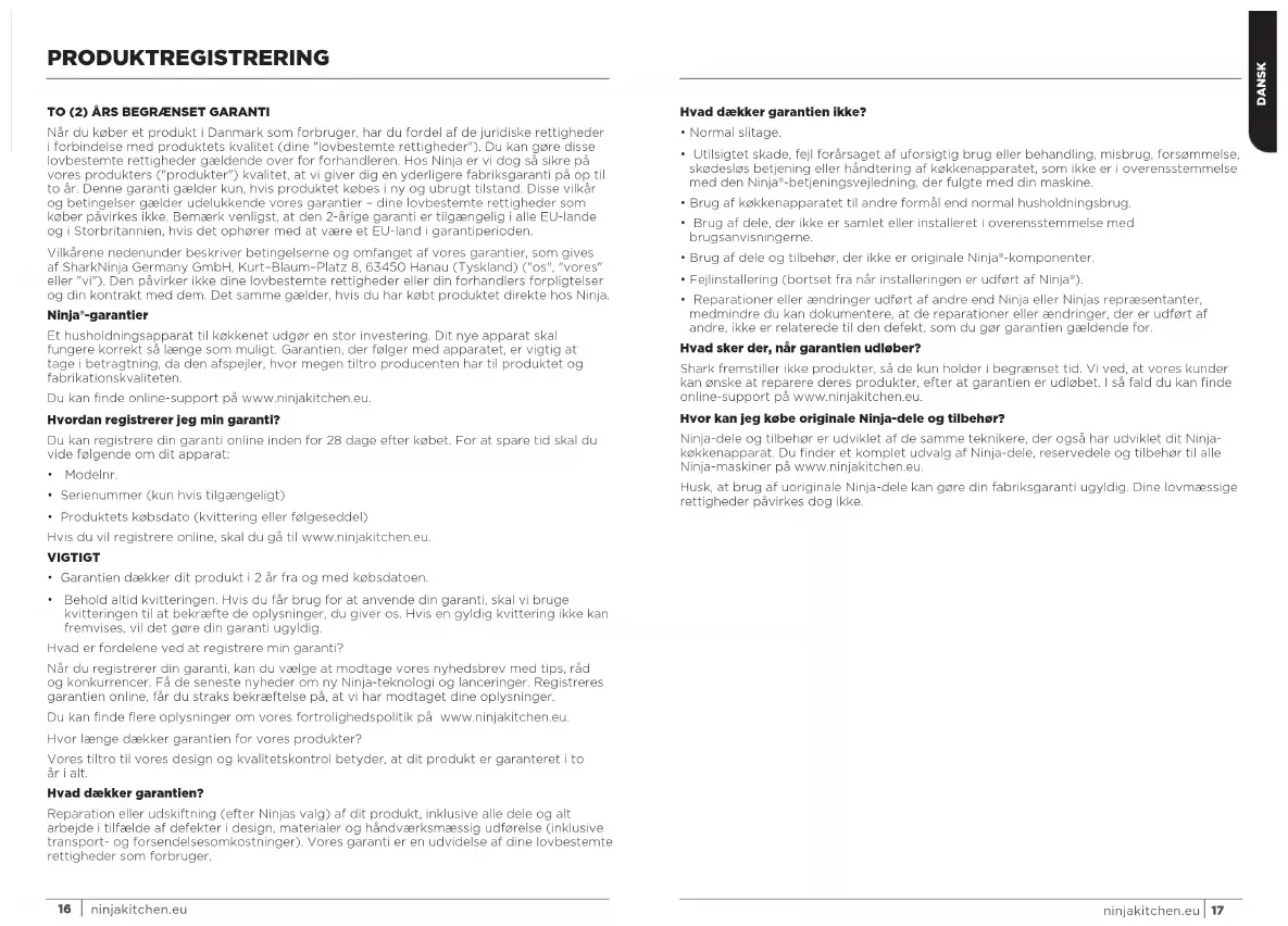 Wenn Sie als Verbraucher ein Produkt in Deutschland kaufen, erhalten Sie automatisch Gewährleistungsrechte hinsichtlich der Produktqualität (Ihre „gesetzlichen Rechte“). Sie können diese gesetzlichen Rechte Ihrem Einzelhändler gegenüber geltend machen. Allerdings haben wir bei Ninja so großes Vertrauen in die Qualität unserer Produkte (die„Produkte“), dass wir Ihnen eine zusätzliche Herstellergarantie von zwei Jahren bieten. Diese Garantie gilt nur, wenn das Produkt neu und unbenutzt gekauft wird. Diese Bedingungen beziehen sich nur auf unsere Garantien – Ihre gesetzlichen Rechte als Käufer bleiben davon unberührt. Bitte beachten Sie, dass die 2-Jahres-Garantie in allen EU-Ländern und dem Vereinigten Königreich angeboten wird, auch für den Fall, dass das Vereinigte Königreich während des Garantiezeitraums kein EU- Mitgliedsland mehr sein wird. In den nachstehenden Bedingungen werden die Bedingungen und der Umfang Ihrer Garantie beschrieben, die von der SharkNinja Germany GmbH, Kurt–Blaum–Platz 8, 63450 Hanau („uns“, „unser“, „wir“) gegeben wird. Sie beeinträchtigen keine gesetzlichen Rechte aus dem Kaufvertrag mit dem Einzelhändler, bei dem Sie das Produkt erworben haben, oder die Verpflichtungen Ihres Einzelhändlers aus dem Kauf und die Ihres Kaufvertrags mit ihm. Das gilt auch, wenn Sie das Produkt direkt von Ninja erworben haben. Ninja®-Garantien Ein Haushaltsküchengerät bedeutet eine beträchtliche Investition. Ihr neues Gerät sollte daher so lange wie möglich funktionieren. Die Garantie spielt dabei eine wichtige Rolle und spiegelt wider, wie viel Vertrauen der Hersteller in sein Produkt und die Herstellungsqualität hat. Unsere Kundendienst-Hotline (0800 000 9063) ist von Montag bis Freitag von 9:00 bis 18:00 Uhr für Sie da. Der Anruf ist kostenlos, und Sie werden sofort zu einem Mitarbeiter von Ninja durchgestellt. Sie erhalten auch Online-Unterstützung unter www.ninjakitchen.eu. Wie registriere ich meine Garantie? Sie können Ihre Garantie innerhalb von 28 Tagen ab dem Kaufdatum online registrieren. UmZeit zu sparen, halten Sie bitte die folgenden Informationen zu Ihrem Gerät bereit:
