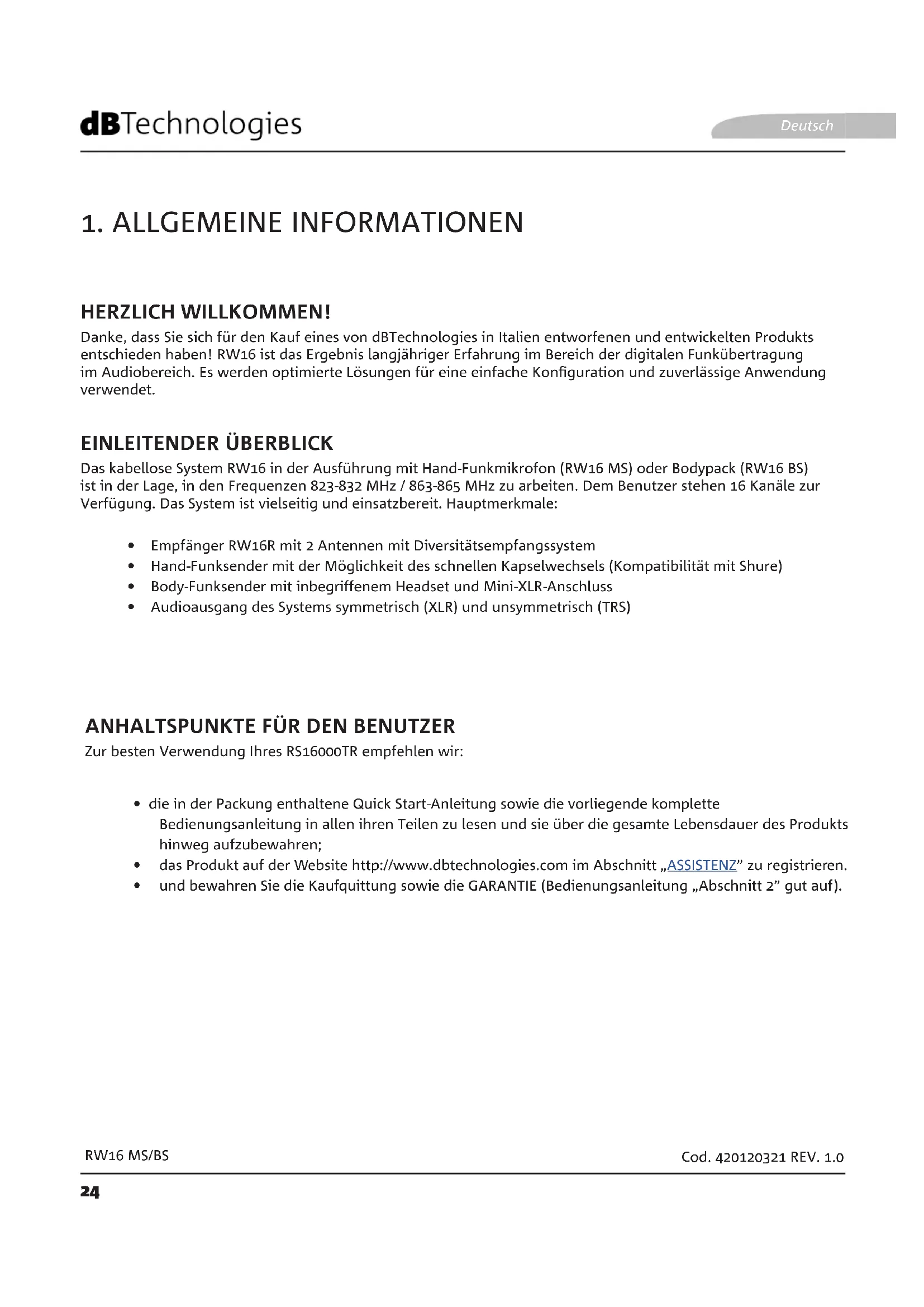 HERZLICH WILLKOMMEN! EINLEITENDER ÜBERBLICK Danke, dass Sie sich für den Kauf eines von dBTechnologies in Italien entworfenen und entwickelten Produkts entschieden haben! RW16 ist das Ergebnis langjähriger Erfahrung im Bereich der digitalen Funkübertragung im Audiobereich. Es werden optimierte Lösungen für eine einfache Konguration und zuverlässige Anwendung verwendet. Das kabellose System RW16 in der Ausführung mit Hand-Funkmikrofon (RW16 MS) oder Bodypack (RW16 BS) ist in der Lage, in den Frequenzen 823-832 MHz / 863-865 MHz zu arbeiten. Dem Benutzer stehen 16 Kanäle zur Verfügung. Das System ist vielseitig und einsatzbereit. Hauptmerkmale: