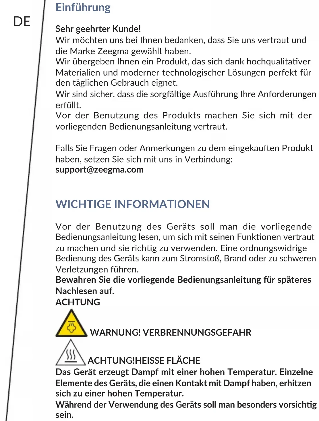 Clean the hand steam wash, tube and head with a so and dry cloth. The pictures are for reference only. The real design of the products may dier from the pictures presented.DE Einführung Sehr geehrter Kunde! Wir möchten uns bei Ihnen bedanken, dass Sie uns vertraut und die Marke Zeegma gewählt haben. Wir übergeben Ihnen ein Produkt, das sich dank hochqualitaver Materialien und moderner technologischer Lösungen perfekt für den täglichen Gebrauch eignet. Wir sind sicher, dass die sorgfälge Ausführung Ihre Anforderungen erfüllt. Vor der Benutzung des Produkts machen Sie sich mit der vorliegenden Bedienungsanleitung vertraut. Falls Sie Fragen oder Anmerkungen zu dem eingekauen Produkt haben, setzen Sie sich mit uns in Verbindung: support@zeegma.com WICHTIGE INFORMATIONEN Vor der Benutzung des Geräts soll man die vorliegende Bedienungsanleitung lesen, um sich mit seinen Funkonen vertraut zu machen und sie richg zu verwenden. Eine ordnungswidrige Bedienung des Geräts kann zum Stromstoß, Brand oder zu schweren Verletzungen führen. Bewahren Sie die vorliegende Bedienungsanleitung für späteres Nachlesen auf. ACHTUNG WARNUNG! VERBRENNUNGSGEFAHR