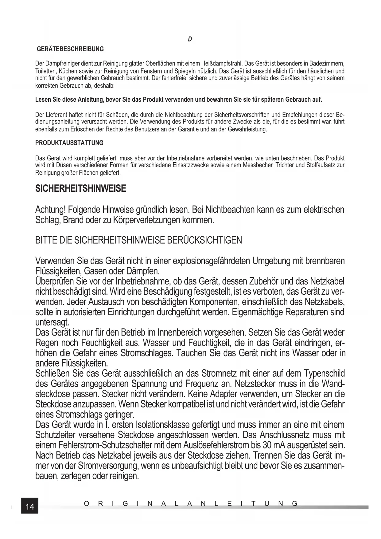 GERÄTEBESCHREIBUNG Der Dampfreiniger dient zur Reinigung glatter Oberfl ächen mit einem Heißdampfstrahl. Das Gerät ist besonders in Badezimmern, Toiletten, Küchen sowie zur Reinigung von Fenstern und Spiegeln nützlich. Das Gerät ist ausschließlich für den häuslichen und nicht für den gewerblichen Gebrauch bestimmt. Der fehlerfreie, sichere und zuverlässige Betrieb des Gerätes hängt von seinem korrekten Gebrauch ab, deshalb: Lesen Sie diese Anleitung, bevor Sie das Produkt verwenden und bewahren Sie sie für späteren Gebrauch auf. Der Lieferant haftet nicht für Schäden, die durch die Nichtbeachtung der Sicherheitsvorschriften und Empfehlungen dieser Be- dienungsanleitung verursacht werden. Die Verwendung des Produkts für andere Zwecke als die, für die es bestimmt war, führt ebenfalls zum Erlöschen der Rechte des Benutzers an der Garantie und an der Gewährleistung. PRODUKTAUSSTATTUNG Das Gerät wird komplett geliefert, muss aber vor der Inbetriebnahme vorbereitet werden, wie unten beschrieben. Das Produkt wird mit Düsen verschiedener Formen für verschiedene Einsatzzwecke sowie einem Messbecher, Trichter und Stoff aufsatz zur Reinigung großer Flächen geliefert. SICHERHEITSHINWEISE Achtung! Folgende Hinweise gründlich lesen. Bei Nichtbeachten kann es zum elektrischen Schlag, Brand oder zu Körperverletzungen kommen.