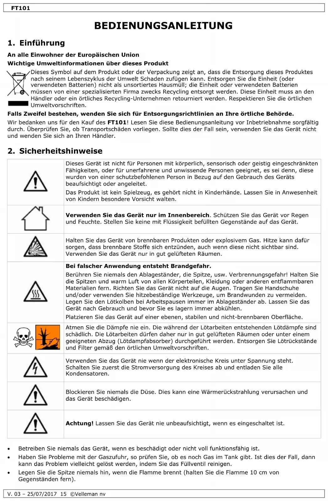 Länge.................................................................................................................... 60 cm Durchmesser Brenner ............................................................................................... 6 cm Schlauch ................................................................................................................ 1.5 m Verwenden Sie dieses Gerät nur mit originellen Zubehörteilen. Velleman NV übernimmt keine Haftung für Schaden oder Verletzungen bei (falscher) Anwendung dieses Gerätes. Für mehr Informationen zu diesem Produkt und die neueste Version dieser Bedienungsanleitung, siehe www.toolland.eu. Alle Änderungen ohne vorherige Ankündigung vorbehalten. © URHEBERRECHT Velleman NV besitzt das Urheberrecht für diese Bedienungsanleitung. Alle weltweiten Rechte vorbehalten. Ohne vorherige schriftliche Genehmigung des Urhebers ist es nicht gestattet, diese Bedienungsanleitung ganz oder in Teilen zu reproduzieren, zu kopieren, zu übersetzen, zu bearbeiten oder zu speichern.FT101