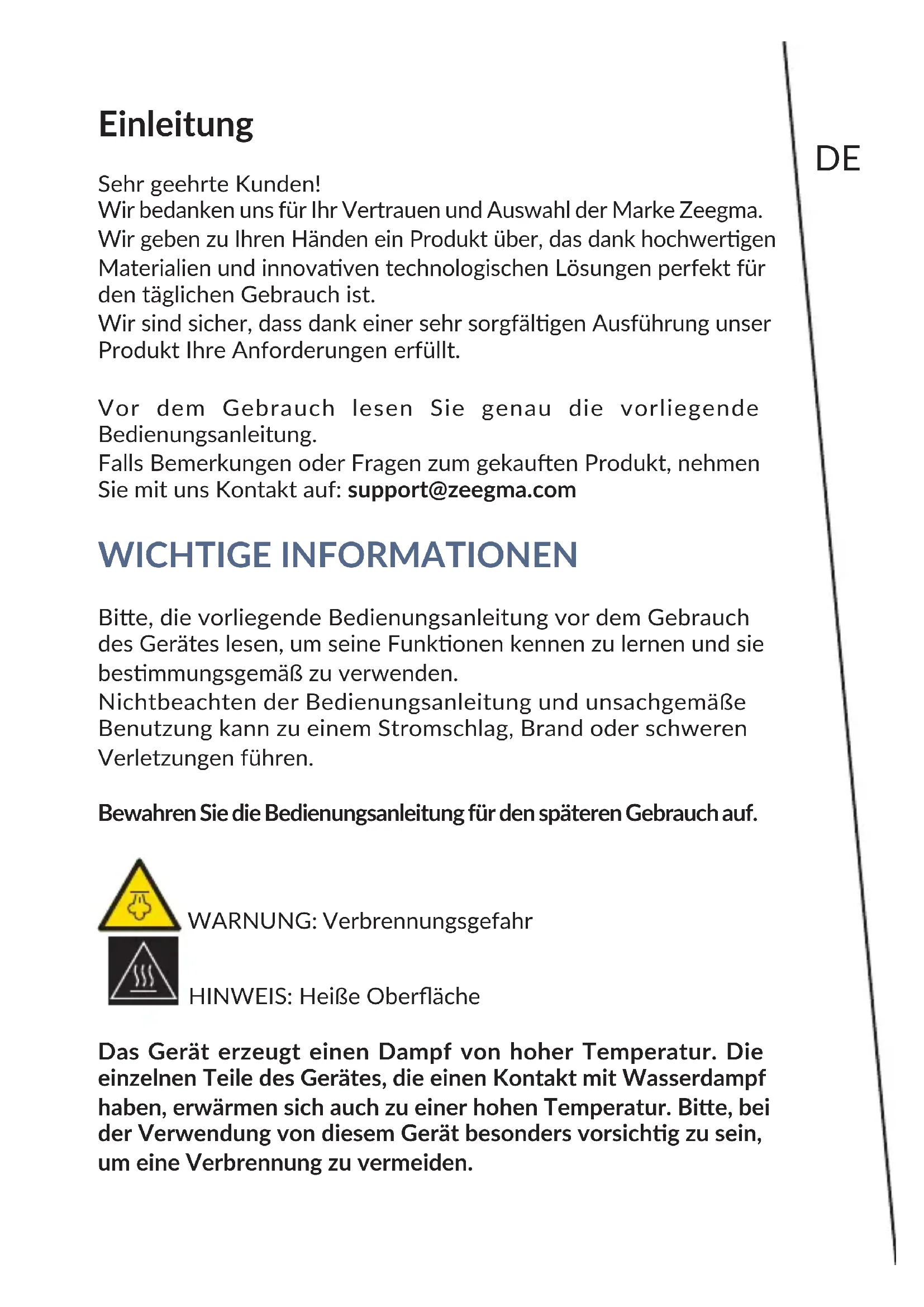 The product complies with requirements of EU direcves. Pursuant to the Direcve 2012/19/EU, this product is subject to selecve collecon. The product must not be disposed of along with domesc waste as it may pose a threat to the environment and human health. The worn-out product must be handed over to the electrics and electronics recycling center. The pictures and diagrams are for reference only. The real design of the products may dier from the pictures and diagrams presented.DE Einleitung Sehr geehrte Kunden! Wir bedanken uns für Ihr Vertrauen und Auswahl der Marke Zeegma. Wir geben zu Ihren Händen ein Produkt über, das dank hochwergen Materialien und innovaven technologischen Lösungen perfekt für den täglichen Gebrauch ist. Wir sind sicher, dass dank einer sehr sorgfälgen Ausführung unser Produkt Ihre Anforderungen erfüllt. Vor dem Gebrauch lesen Sie genau die vorliegende Bedienungsanleitung. Falls Bemerkungen oder Fragen zum gekauen Produkt, nehmen Sie mit uns Kontakt auf: support@zeegma.com WICHTIGE INFORMATIONEN Bie, die vorliegende Bedienungsanleitung vor dem Gebrauch des Gerätes lesen, um seine Funkonen kennen zu lernen und sie besmmungsgemäß zu verwenden. Nichtbeachten der Bedienungsanleitung und unsachgemäße Benutzung kann zu einem Stromschlag, Brand oder schweren Verletzungen führen. Bewahren Sie die Bedienungsanleitung für den späteren Gebrauch auf. WARNUNG: Verbrennungsgefahr HINWEIS: Heiße Oberäche Das Gerät erzeugt einen Dampf von hoher Temperatur. Die einzelnen Teile des Gerätes, die einen Kontakt mit Wasserdampf haben, erwärmen sich auch zu einer hohen Temperatur. Bie, bei der Verwendung von diesem Gerät besonders vorsichg zu sein, um eine Verbrennung zu vermeiden.DE