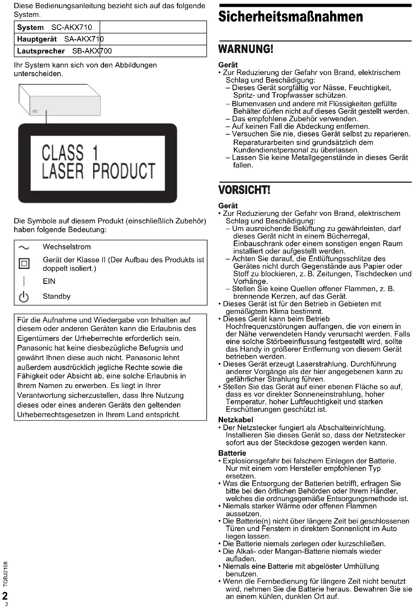 - Wenn die Fernbedienung für längere Zeit nicht benutzt wird, nehmen Sie die Batterie heraus. Bewahren Sie sie an einem kühlen, dunklen Ort auf. System SC-AKX710 Hauptgerät SA-AKX710 Lautsprecher SB-AKX700 Wechselstrom Gerät der Klasse II (Der Aufbau des Produkts ist doppelt isoliert.) EIN Standby Für die Aufnahme und Wiedergabe von Inhalten auf diesem oder anderen Geräten kann die Erlaubnis des Eigentümers der Urheberrechte erforderlich sein. Panasonic hat keine diesbezügliche Befugnis und gewährt Ihnen diese auch nicht. Panasonic lehnt außerdem ausdrücklich jegliche Rechte sowie die Fähigkeit oder Absicht ab, eine solche Erlaubnis in Ihrem Namen zu erwerben. Es liegt in Ihrer Verantwortung sicherzustellen, dass Ihre Nutzung dieses oder eines anderen Geräts den geltenden Urheberrechtsgesetzen in Ihrem Land entspricht. AKX710E TQBJ2108-1.book Page 2 Monday, July 18, 2022 10:56 AM3 TQBJ2108
