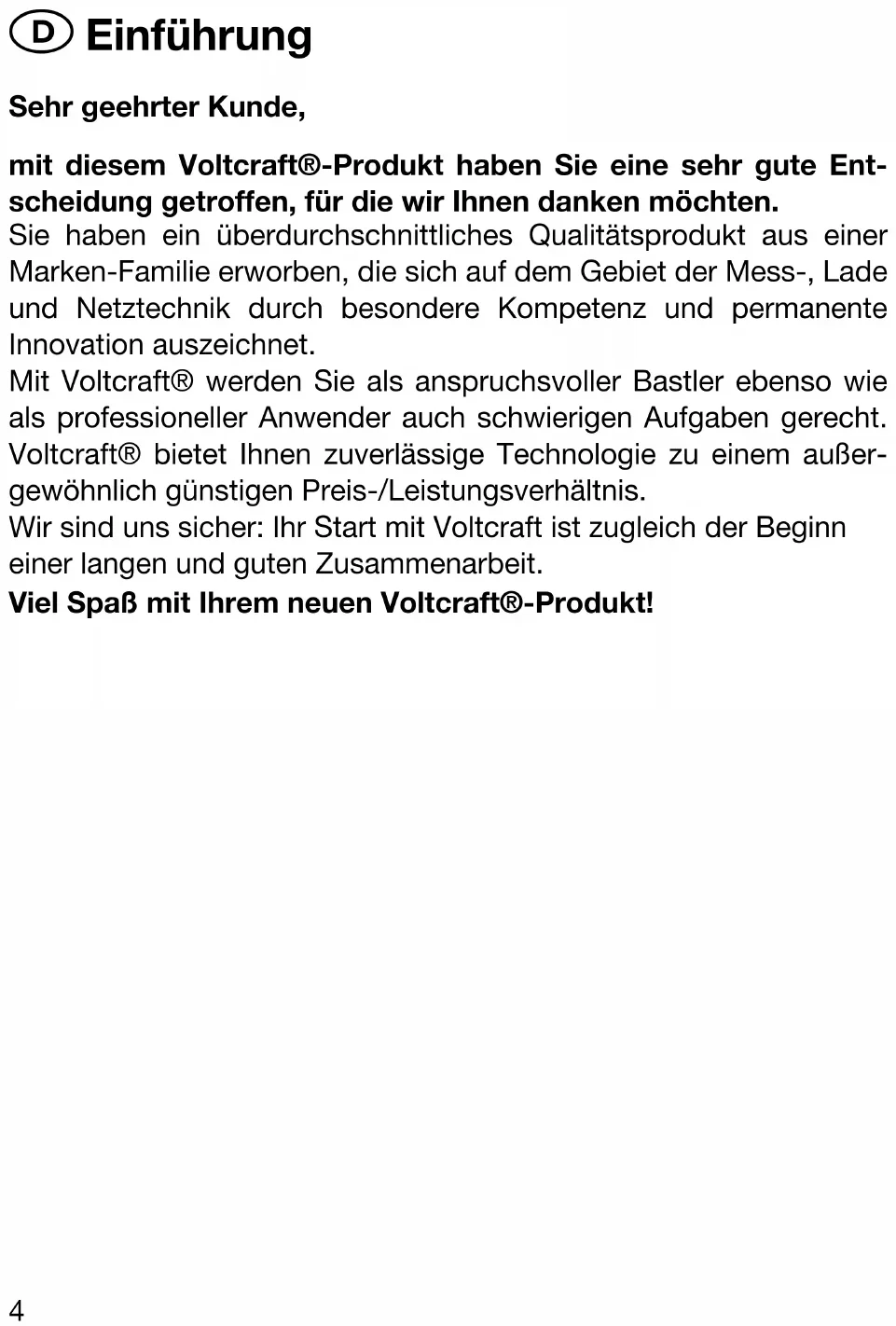 - Deze gebruiksaanwijzing hoort bij dit product en bevat belan- grijke richtlijnen voor de ingebruikneming en het gebruik. Let hierop, ook als u dit product aan derden doorgeeft. Bewaar daarom de gebruiksaanwijzing om deze in voorkomende geval- len te kunnen raadplegen! In de inhoudsopgave op pagina 38 vindt u puntsgewijs de behandelde onderwerpen met vermelding van het bijbehorende paginanummer.3 Einführung Sehr geehrter Kunde, mit diesem Voltcraft®-Produkt haben Sie eine sehr gute Ent- scheidung getroffen, für die wir Ihnen danken möchten. Sie haben ein überdurchschnittliches Qualitätsprodukt aus einer Marken-Familie erworben, die sich auf dem Gebiet der Mess-, Lade und Netztechnik durch besondere Kompetenz und permanente Innovation auszeichnet. Mit Voltcraft® werden Sie als anspruchsvoller Bastler ebenso wie als professioneller Anwender auch schwierigen Aufgaben gerecht. Voltcraft® bietet Ihnen zuverlässige Technologie zu einem außer- gewöhnlich günstigen Preis-/Leistungsverhältnis. Wir sind uns sicher: Ihr Start mit Voltcraft ist zugleich der Beginn einer langen und guten Zusammenarbeit. Viel Spaß mit Ihrem neuen Voltcraft®-Produkt! 4Inhaltsverzeichnis Einführung p. 4