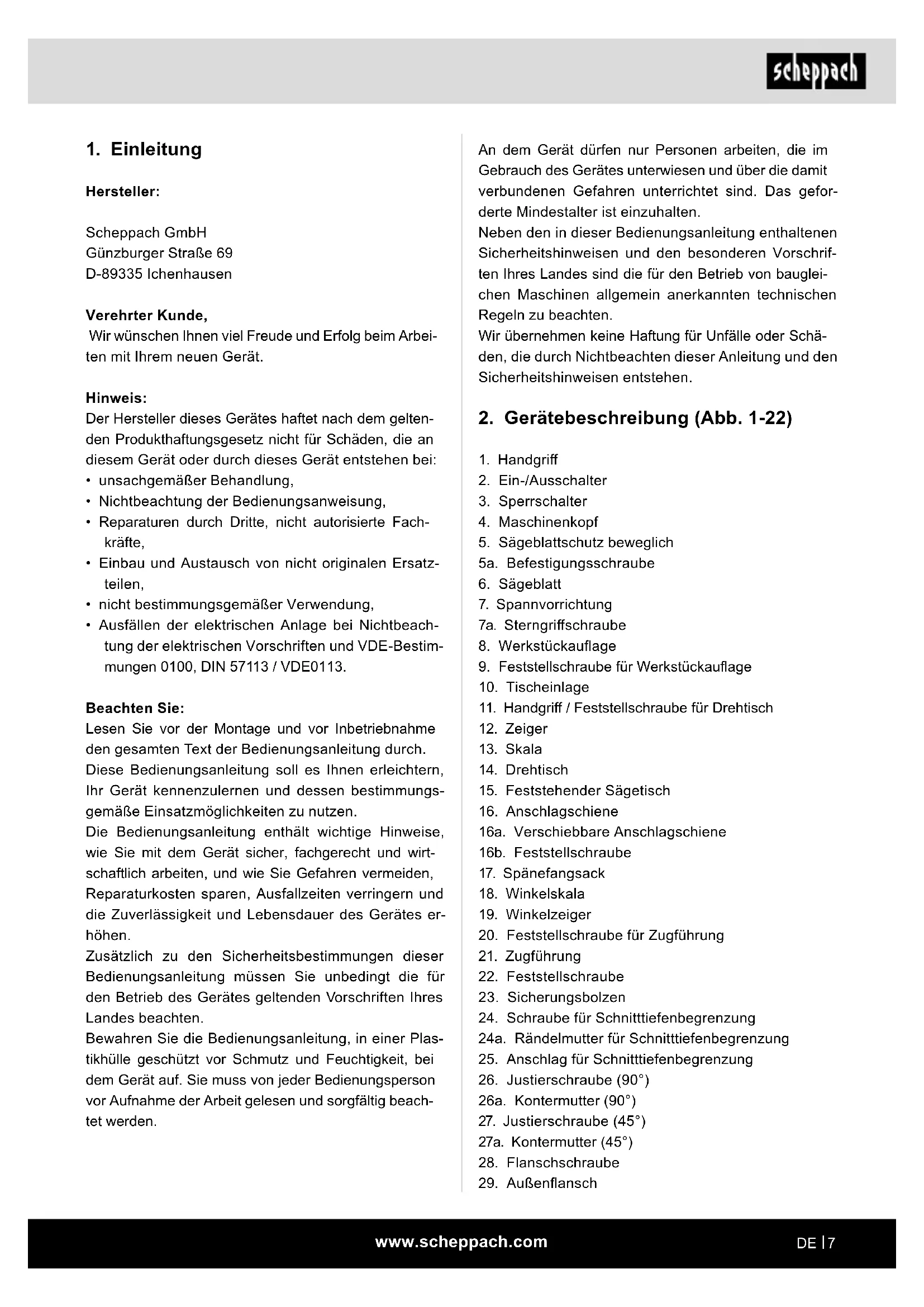 Hersteller: Scheppach GmbH Günzburger Straße 69 D-89335 Ichenhausen Verehrter Kunde, Wir wünschen Ihnen viel Freude und Erfolg beim Arbei- ten mit Ihrem neuen Gerät. Hinweis: Der Hersteller dieses Gerätes haftet nach dem gelten- den Produkthaftungsgesetz nicht für Schäden, die an diesem Gerät oder durch dieses Gerät entstehen bei:
