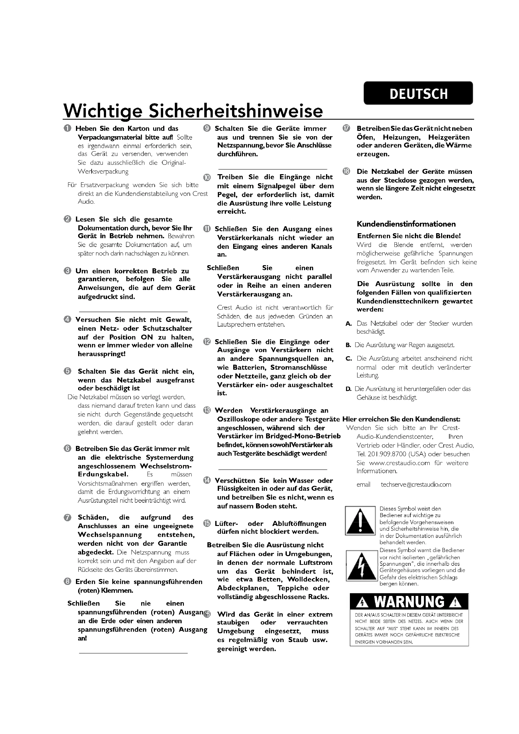 Hier erreichen Sie den Kundendienst: Wenden Sie sich bitte an Ihr Crest-Audio-Kundendienstcenter, Ihren Vertrieb oder Händler, oder Crest Audio, Tel. 201.909.8700 (USA) oder besuchen Sie www.crestaudio.com für weitere Informationen. email techserve@crestaudio.comDieses Symbol weist den Bediener auf wichtige zu befolgende Vorgehensweisen und Sicherheitshinweise hin, die in der Dokumentation ausführlich behandelt werden.Dieses Symbol warnt die Bediener vor nicht isolierten „gefährlichen Spannungen“, die innerhalb des Gerätegehäuses vorliegen und die Gefahr des elektrischen Schlags bergen können. Wichtige Sicherheitshinweise WARNUNG DER AN/AUS SCHALTER IN DIESEM GERÄT UNTERBRICHT NICHT BEIDE SEITEN DES NETZES. AUCH WENN DER SCHALTER AUF "AUS" STEHT KANN IM INNERN DES GERÄTES IMMER NOCH GEFÄHRLICHE ELEKTRISCHE ENERGIEN VORHANDEN SEIN. DEUTSCHp. 20 Inhalt