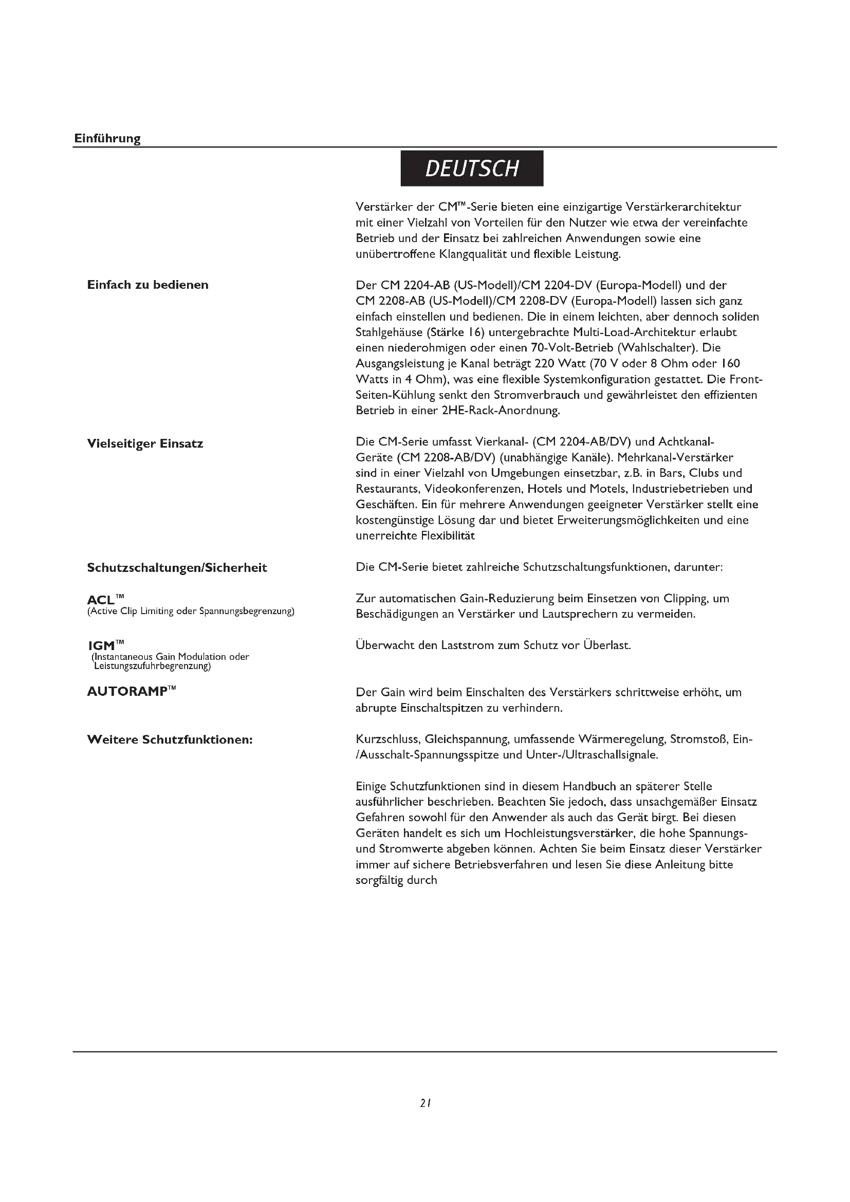 -Serie bieten eine einzigartige Verstärkerarchitektur mit einer Vielzahl von Vorteilen für den Nutzer wie etwa der vereinfachte Betrieb und der Einsatz bei zahlreichen Anwendungen sowie eine unübertroffene Klangqualität und flexible Leistung. Der CM 2204-AB (US-Modell)/CM 2204-DV (Europa-Modell) und der CM 2208-AB (US-Modell)/CM 2208-DV (Europa-Modell) lassen sich ganz einfach einstellen und bedienen. Die in einem leichten, aber dennoch soliden Stahlgehäuse (Stärke 16) untergebrachte Multi-Load-Architektur erlaubt einen niederohmigen oder einen 70-Volt-Betrieb (Wahlschalter). Die Ausgangsleistung je Kanal beträgt 220 Watt (70 V oder 8 Ohm oder 160 Watts in 4 Ohm), was eine flexible Systemkonfiguration gestattet. Die Front- Seiten-Kühlung senkt den Stromverbrauch und gewährleistet den effizienten Betrieb in einer 2HE-Rack-Anordnung. Die CM-Serie umfasst Vierkanal- (CM 2204-AB/DV) und Achtkanal- Geräte (CM 2208-AB/DV) (unabhängige Kanäle). Mehrkanal-Verstärker sind in einer Vielzahl von Umgebungen einsetzbar, z.B. in Bars, Clubs und Restaurants, Videokonferenzen, Hotels und Motels, Industriebetrieben und Geschäften. Ein für mehrere Anwendungen geeigneter Verstärker stellt eine kostengünstige Lösung dar und bietet Erweiterungsmöglichkeiten und eine unerreichte Flexibilität Die CM-Serie bietet zahlreiche Schutzschaltungsfunktionen, darunter: Zur automatischen Gain-Reduzierung beim Einsetzen von Clipping, um Beschädigungen an Verstärker und Lautsprechern zu vermeiden. Überwacht den Laststrom zum Schutz vor Überlast. Der Gain wird beim Einschalten des Verstärkers schrittweise erhöht, um abrupte Einschaltspitzen zu verhindern. Kurzschluss, Gleichspannung, umfassende Wärmeregelung, Stromstoß, Ein- /Ausschalt-Spannungsspitze und Unter-/Ultraschallsignale. Einige Schutzfunktionen sind in diesem Handbuch an späterer Stelle ausführlicher beschrieben. Beachten Sie jedoch, dass unsachgemäßer Einsatz Gefahren sowohl für den Anwender als auch das Gerät birgt. Bei diesen Geräten handelt es sich um Hochleistungsverstärker, die hohe Spannungs- und Stromwerte abgeben können. Achten Sie beim Einsatz dieser Verstärker immer auf sichere Betriebsverfahren und lesen Sie diese Anleitung bitte sorgfältig durch